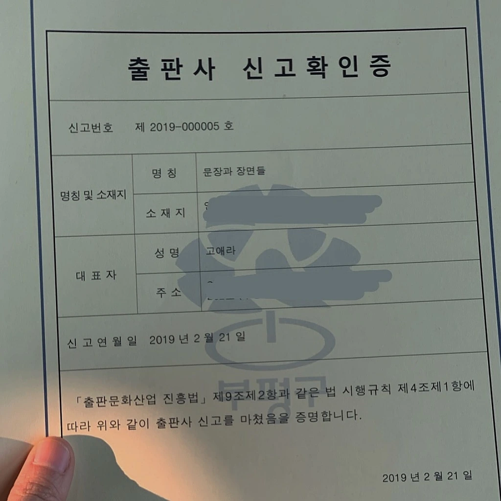 *오늘 <문장과 장면들> 1인 출판사 신고확인증을 수령했습니다. 앞으로 출판사 대표로서도 더욱 새롭고 즐거운 일들을 만들어갈 생각이에요. 많은 응원과 애정 부탁드려요.