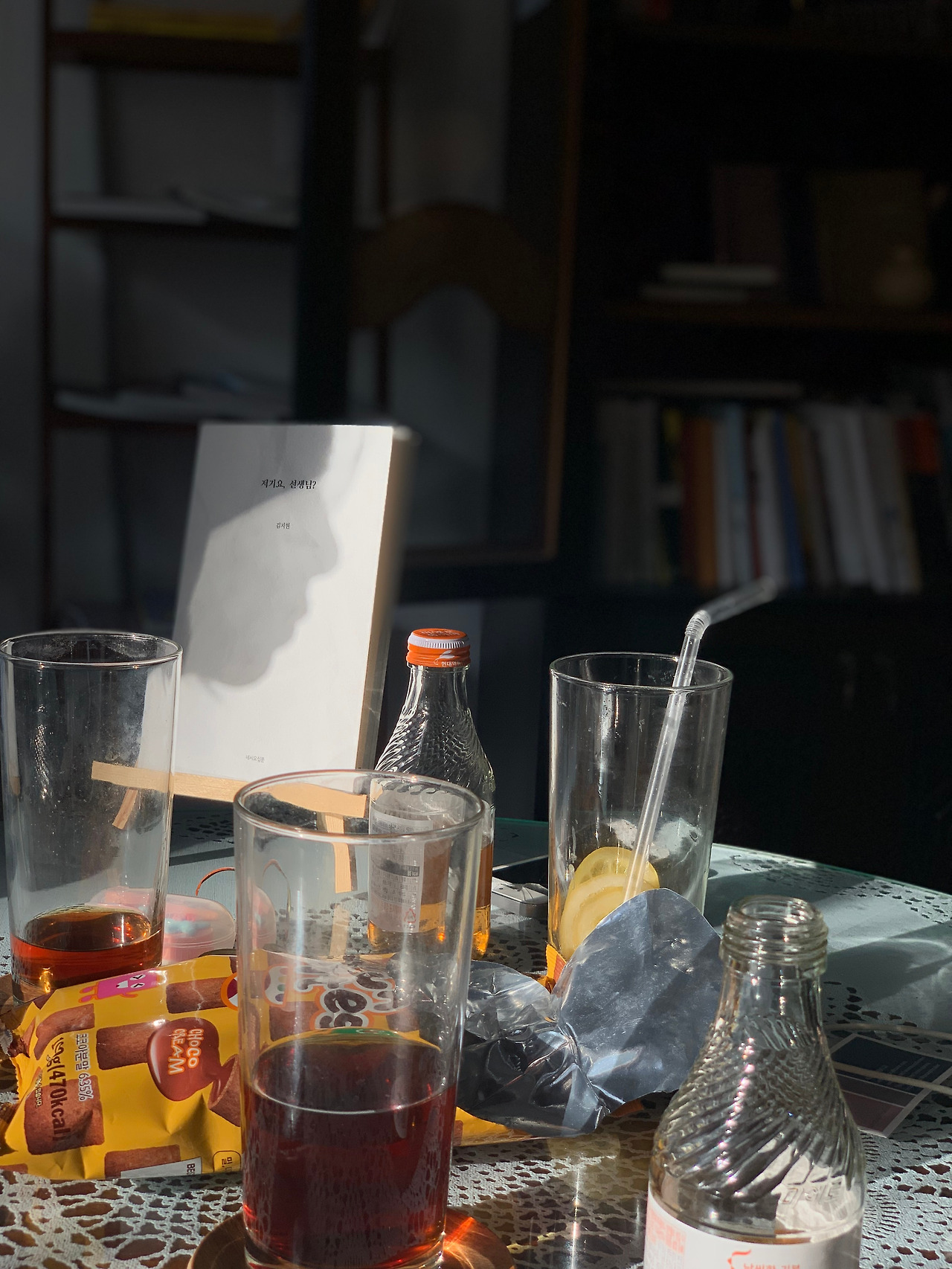 정신없이 시선을 옮겨내며 대화를 잇다가 눈에 들어온 장면. 서로 다른 곳에서 온 테이블 위 음료와 과자와 그림자 입은 책이 하나의 그림처럼 어우러진 모습은, 그 곁을 둘러앉은 우리, 같았다.