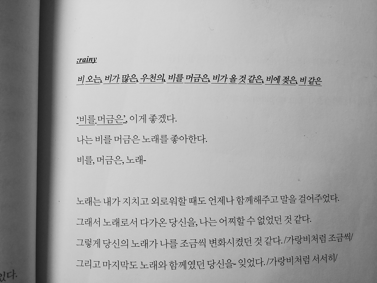 '비를 머금은 노래'라는 글은 지금 생각하기에는 조금은 귀엽고 우습지만, 당시에는 나름대로 절절했던 첫사랑 아닌 첫사랑에 대한 이야기였다.