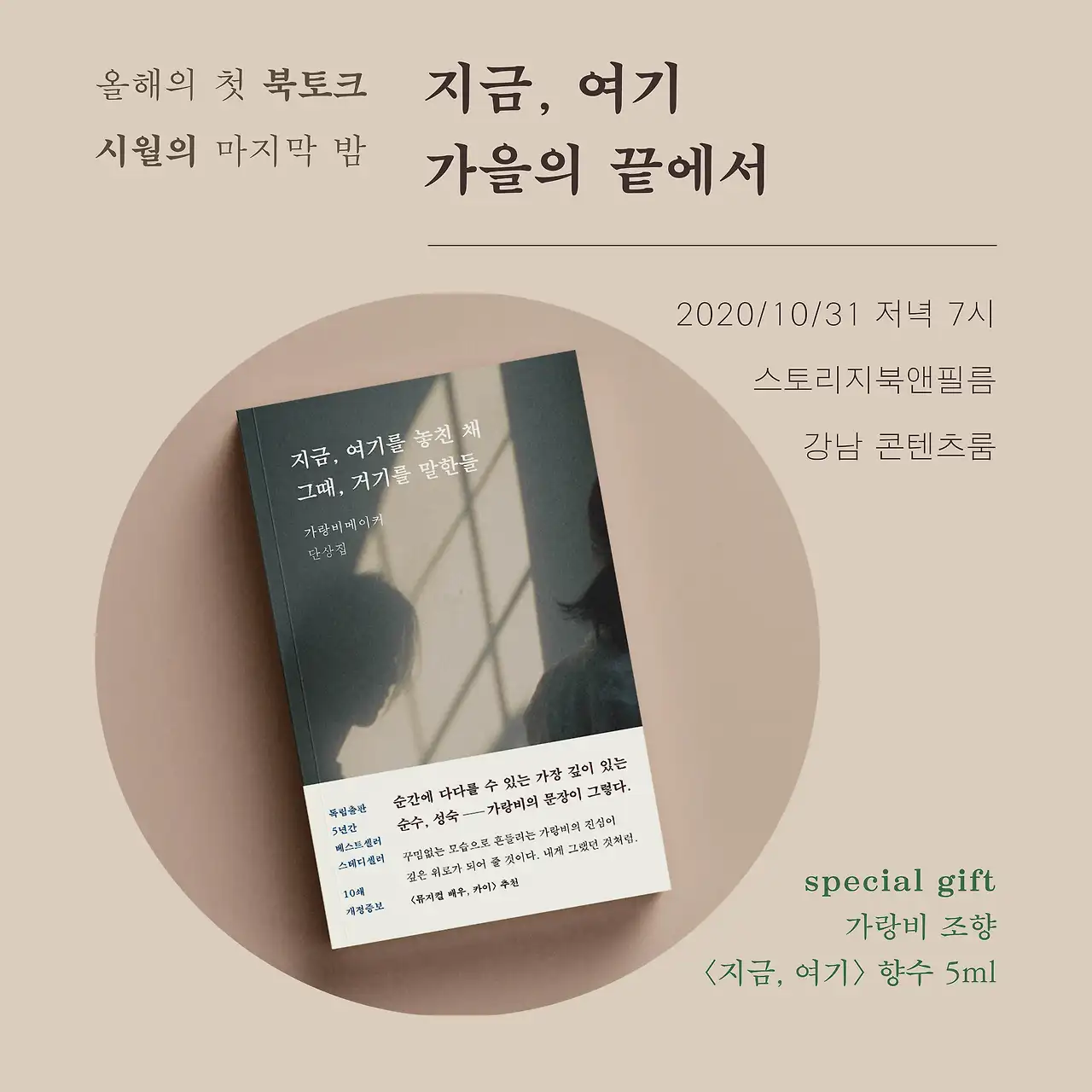 코로나로 지쳐 있는 이들을 위해 조금 더 프라이빗하고 깊은 자리를 만들고자, 소규모 북토크 <지금, 여기 가을의 끝자락>을 열게 되었습니다! 귀한 걸음을 옮겨 오시는 분들께 제가 직접 만든 특별한 선물도 전해드리려 합니다. (늘 받기만 했기에 돌아가는 길에 저도 역조공?이라는 걸 해드리고 싶었거든요.)