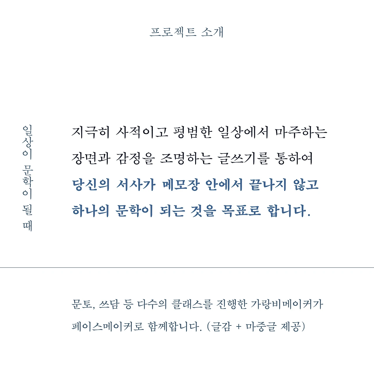 - 참여자 특전인 강연 [에세이를 시작하는 당신에게]를 개별적으로 신청할 수 있습니다. (강의비 2만원 / 프로젝트 신청 시 차액 입금)