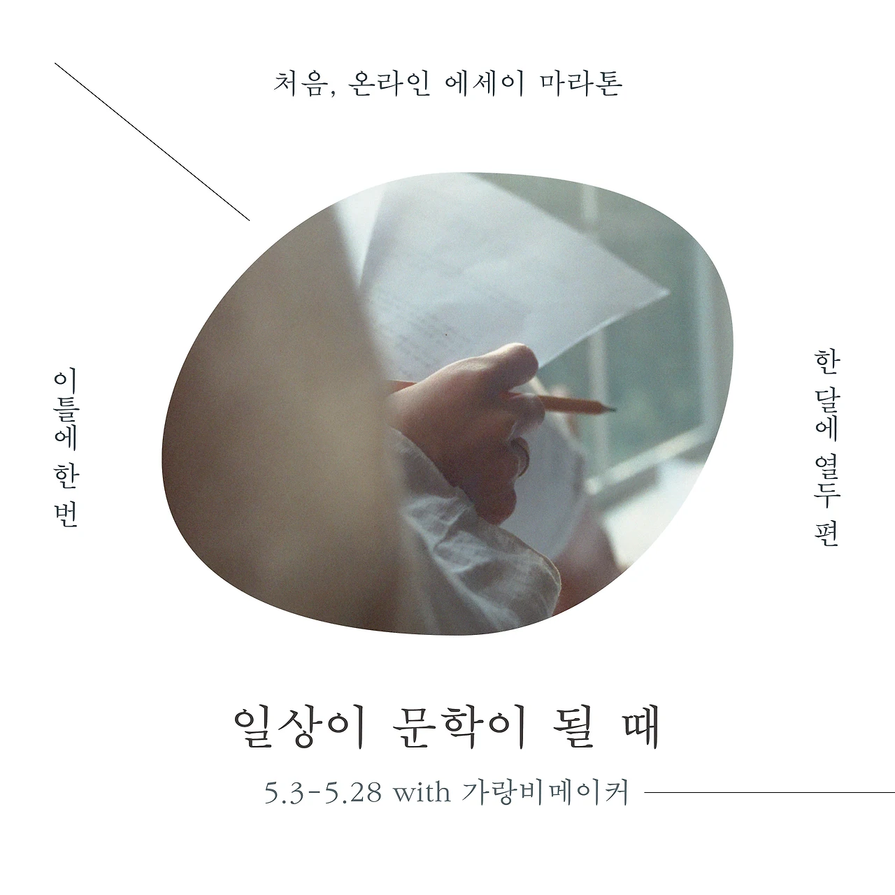 5월, 한 달간 12편의 에세이를 남기는 프로젝트입니다. 작가 가랑비메이커가 선별하여 제공하는 글감과 마중글을 출발점 삼아, 이틀에 한 번 당신의 일상을 담은 에세이 한 편 작성합니다. (익일 자정까지 제출)