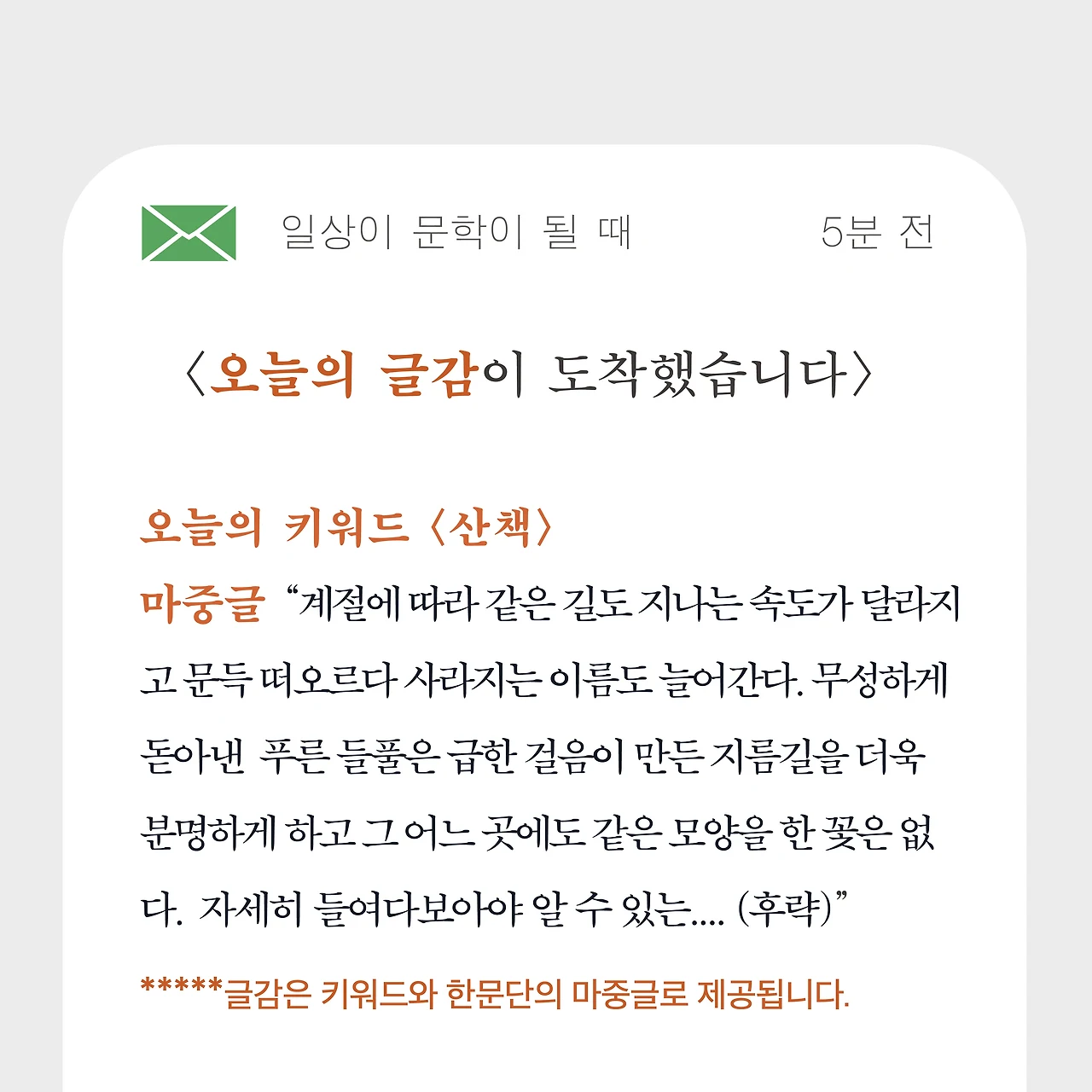 - 월/수/금 오전 9시 [글감 & 한 문단] 메일이 제공됩니다.