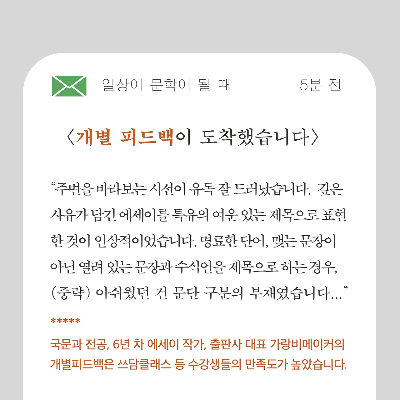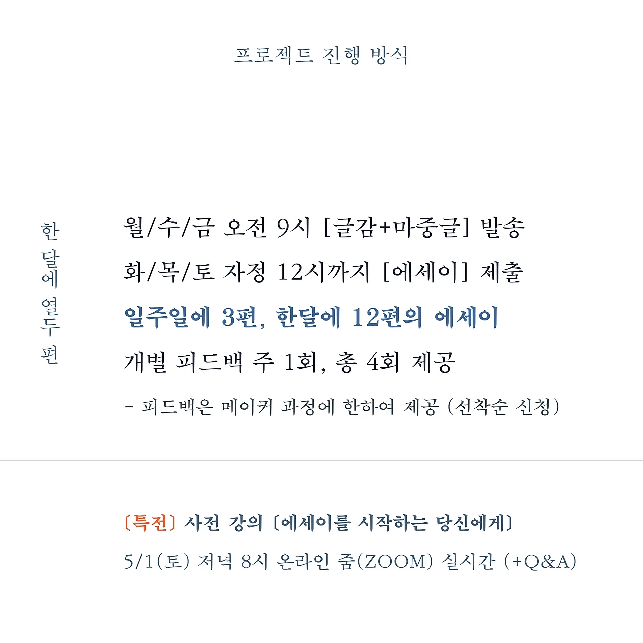 - (피드백 4회 제공) 매주 제출한 3편의 에세이에 대한 가랑비메이커의 피드백은 토-일 주말 간 진행되며, 해당 피드백은 매주 월요일 오전 9시 한 주의 첫 글감과 함께 메일로 제공됩니다.