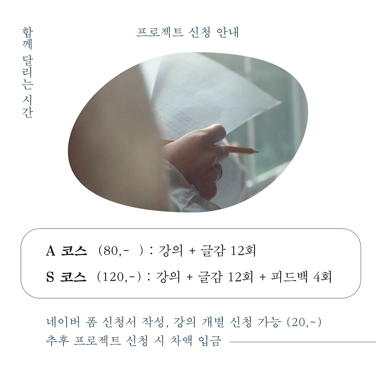 - S코스 (온라인강의 1회 + 글감 12회 + 피드백 4회) 12만원 선착순 마감 10명