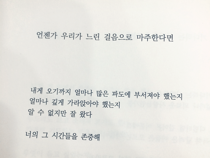 작은 메모지 한 장, 페이지 하나 허락되지 않았더라면 나를 휩쓸고 다시 돌아서버렸던 그 등들을 나는 어떻게 견뎌낼 수 있었을까. 여전히 그런 이야기들을 털어놓는 것이 어색한 나는 마주한 페이지 앞에서도 한참을 망설이다 결국 덮고 마는, 어설프고 부족한 사람인데.