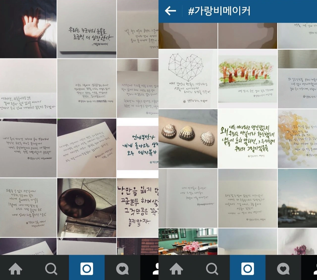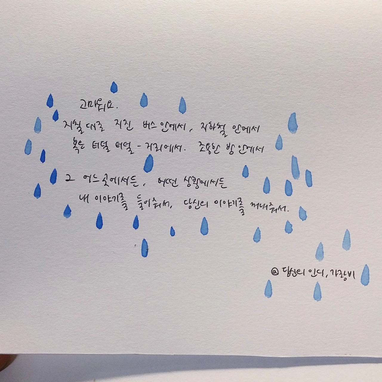 내가 주로 활동하는 곳은 SNS 인스타그램이다. 인스타그램의 특성상, 가랑비의 문장들을 줄 글로 표현하기 보다는 손글씨, 캘리그래피 등- 가랑비만의 문체로 전하고 있다. 몇몇 분들이 비틀 비틀, 위태로워 보이는 가랑비의 필체를 애정 해주셔서 감사한 마음으로 꾹 꾹 쓴 글자들로 여러 생각들을 나누고 있다.
