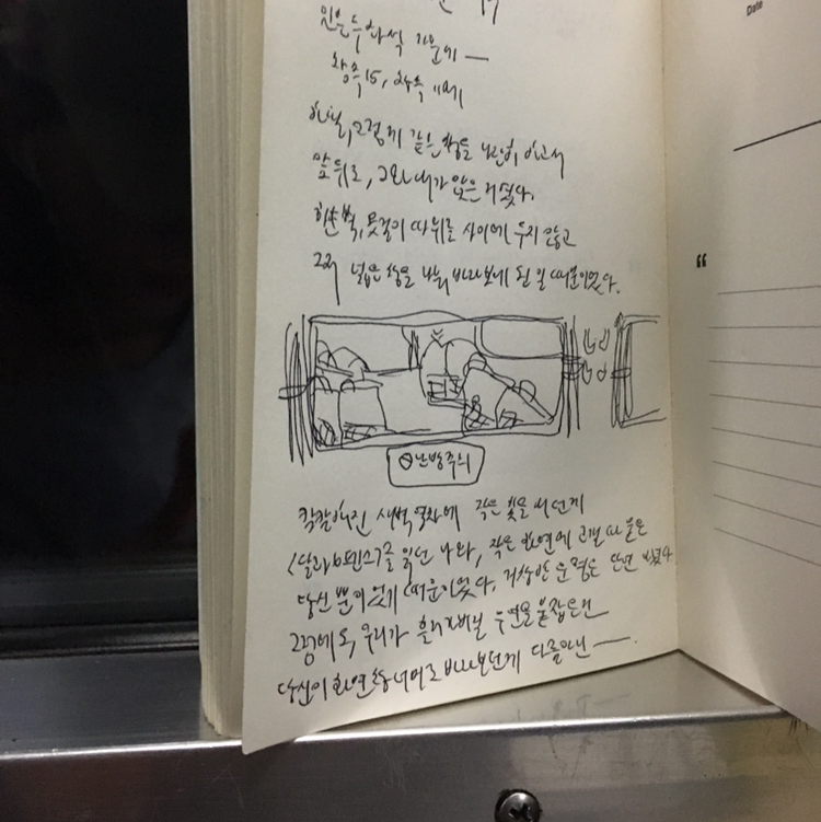 밤기차, 창가자리에 앉으며 상상했던 것은 캄캄한 열차 밖으로 보이는 작은 불빛들, 사색에 잠기기 좋은 고요함이었다. 그러나 내 상상은 조금 다르게 흘러갔는데, 늦은 시각부터 이른 시간까지 달리는 기차였음에도 처음과 끝까지 환한 불을 끄지 않는 거였다.