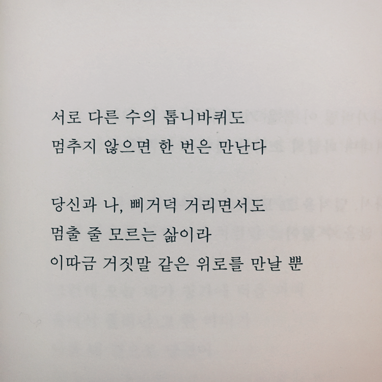 "너와 함께했던 몇 번의 만남에서 내가 겨울 같았을지는 모르겠지만 그건 그저 지나가는 계절이었을 수도 있어. 봄여름 가을 겨울 중 겨울. 지금 나는 쉽지 않은 계절을 지나는 중이고 그걸 너에게 들켜버렸다면 어쩔 수 없겠지만 착각은 하지 않기를. 너에게 겨울 같은 사람이었다고 해서 내내, 모두에게 차갑고 날카로운 사람일 거라는 착각. 모든 건 계속해서 변하고 나 역시 매일의 내가 처음이야. 내가 네 앞에서 잘 웃지 않았다고 해서 웃음이 없는 사람이라고 판단하지 않기를 바라."