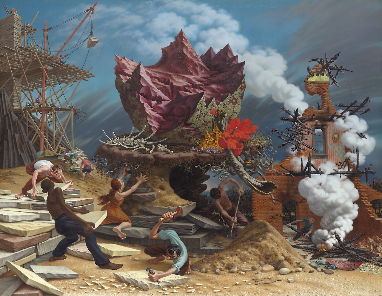 작품은 놀라운 이미지의 병치를 보여준다. 15세기와 16 세기 북유럽의 그들에게서 영감을 얻은 세심한 붓놀림으로 더욱 생생하게 만들어진 초현실주의의 꿈 풍경을 불러 일으킨다. 블룸의 이미지는 쉬운 해석을 허용하지 않는다. 이 작품은 파괴와 재건의 비유를 암시하고 있다. 들쭉날쭉한 바위는 노동자들에 의해 한쪽이 파괴되어 있음에도 불구하고 작품 구성의 중심에 있다. 오른쪽에는 2차 세계 대전 당시의 런던 폭격을 암시하는 이미지인 불타는 집과 목재 연기가 피어오르고 있다. 왼쪽에는 비계로 둘러싸인 새 건물이 노동자들에 의해 건축 되고 있다. 파괴된 자연의 숭배인가. 문명의 발전과 자연 파괴의 상반된 이미지를 드러내려는 의도 인가. 블룸의 이미지는 우리에게 다양한 해석의 장을 열어놓고 있지만, 극사실주의 기법을 통해 우리에게 드러내고자는 극적 긴장은 여전히 파괴와 우울한 재건에 쫓기는 인간 심리를 드러내고 있기도 하다.