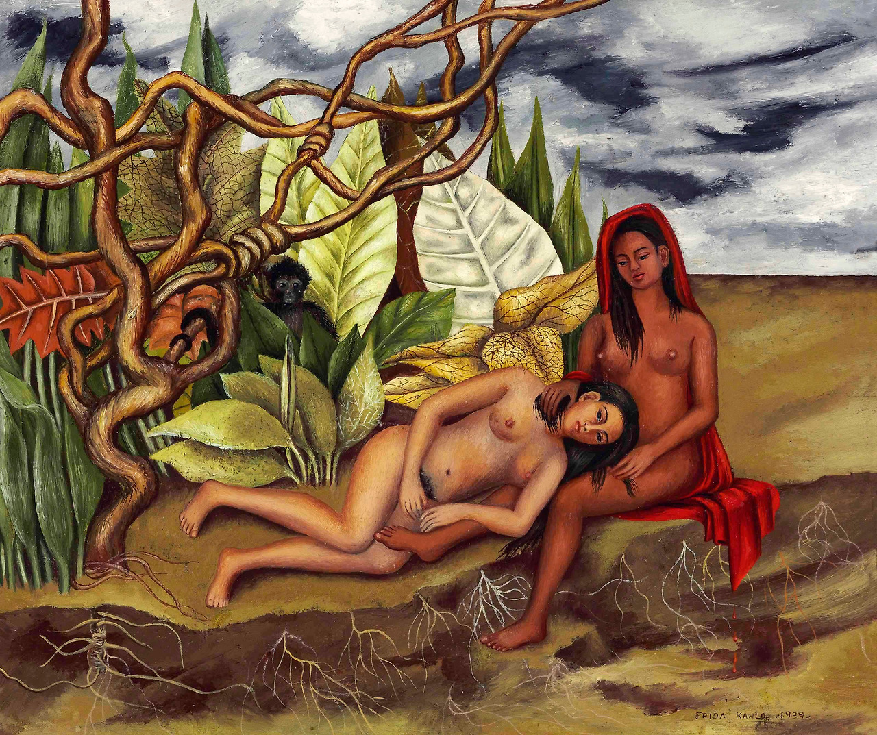 1939년 프리다 칼로의 "숲 속의 두 누드"는 질감, 색, 모양, 빛으로 드러나는 사실적인 묘사로 그려진 꿈같은 사랑 장면이다. 풍경 속의 두 누드는 목가적이어야 하지만, 목가적인 유토피아적인 환경은 주변의 황폐한 환경에 의해 방해받고 있다. 한 여자는 검은 피부에 앉아 있고 가벼운 피부에 반듯한 누드의 인물과 함께, 광활하고 황량한 사막으로 변하는 야생 정글의 끄트머리에 휴식을 취하는 모습이다. 두 인물의 주변에 야생의 정글은 오아시스 일수도 있고 신기루일 수도 있다. 누드 여자들 앞에는 협곡이 있다. 지진으로 인한 갈라진 땅일까. 그 모든 것에도 불구하고 여자들은 몸짓 언어는 친밀감에 대한 애정 표현을 보여준다. 무릎에 머리를 얹고 누워 있는 여인을, 앉아 있는 여인은 슬픈 표정으로 내려다보고 있다. 누워 있는 창백한 누드는 정면을 똑바로 응시하고, 그녀의 전망은 황량하지만, 칼로가 많은 자화상에서 자신을 이미지로 묘사한 것처럼 자신의 얼굴을 고통스럽게 보여주기를 거부한다. 이 두 여성은 모두 의도적으로 익명의 인물 이거나 가상의 얼굴이다. 검은 의자에 앉은 여자는 오른손을 목에 부드럽게 얹어 머리카락을 쥐고 만지작거린다. 머리카락 만져 주는 것은 애정표현이면서 동시에 불안을 해소하는 치유행이기도 하다. 원숭이과 숨어 있는 정글은 두 여인에게는 유토피아이며 사랑 공간이고 삶의 공간이기도 하다. 누드의 두 여인이 정글 속에서 사는 진정한 자유와 행복은 바로 누드이다. 즉 발가벗은 아무것도 걸치지 않은 원초성이야 말고 바로 예술이 지향하는 무위 세계의 구현을 바라는 또 다른 이름이 아닐까.
