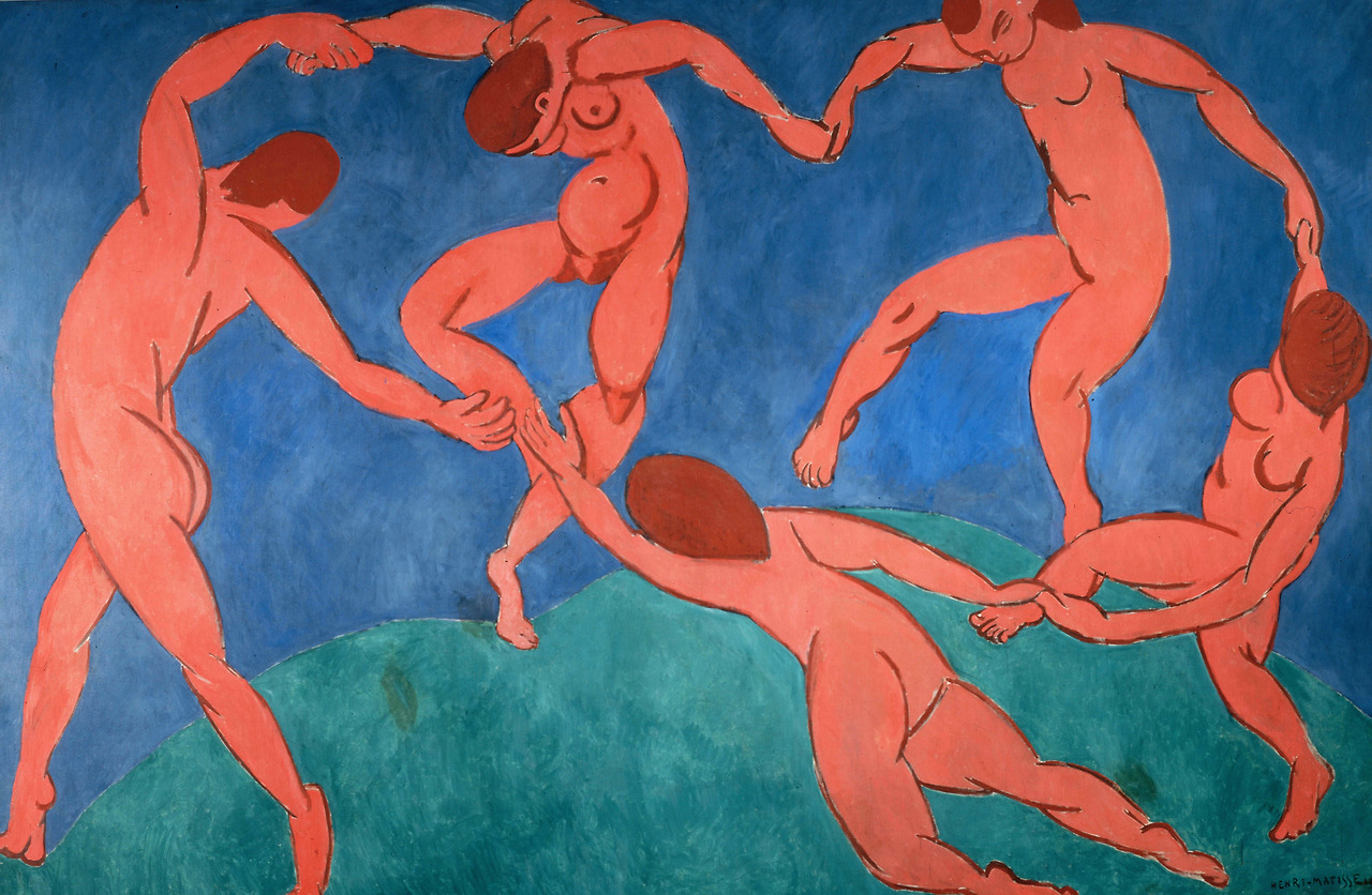 인간이 자연과 우주의 리듬에 무의식적으로 조화롭게 참여하는 방법 중에 하나는 바로 '춤'이 아닐까. 춤의 근원은 멀리 보자면 이교도의 의식적 본성에 가깝다고 볼 수도 있다. 파랑과 초록은 하늘과 땅을 상징하며 뷹운 색은 인간 내적 열기의 상징이다. 빠른 관절의 움직임은 문명에 길들여지지 않은 신체의 리듬이다. 푸른색 우주에서 춤추는 형상은 초록의 언덕 위에서 원심력과 구심력 사이의 균형을 이루고, 초록의 언덕은 사람들의 춤의 리듬에 맞추어 발 밑에서 솟아오르고 가라앉는다. 캔버스 속에는 대지와 인간의 우주적 균형 이외에 춤의 주제에 불필요한 감정을 지니고 있지 않다. 좌우의 힘의 균형과 춤추는 신체의 원무는 공명감을 느끼게 하며 이는 인류 보편성의 획득이기도 하다. '춤'은 개인의 존재 이유를 묻기 전에 인간 전체의 존재 이유를 자연과 우주의 질서 속에 동참하는 원무의 속에서 찾게 한다. 춤추는 신체의 리듬이 곧 우주의 활성이다.