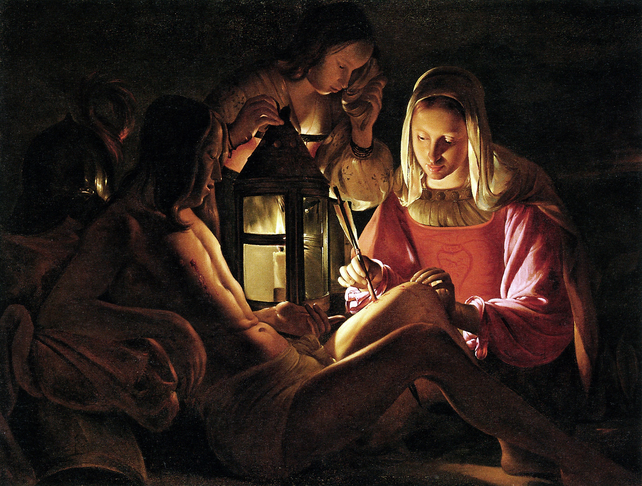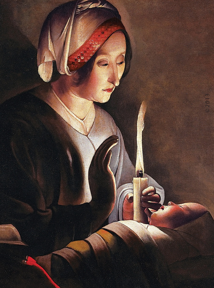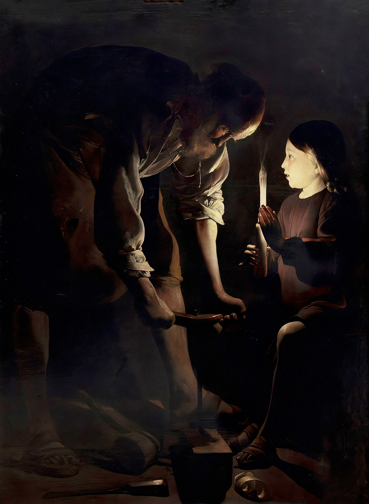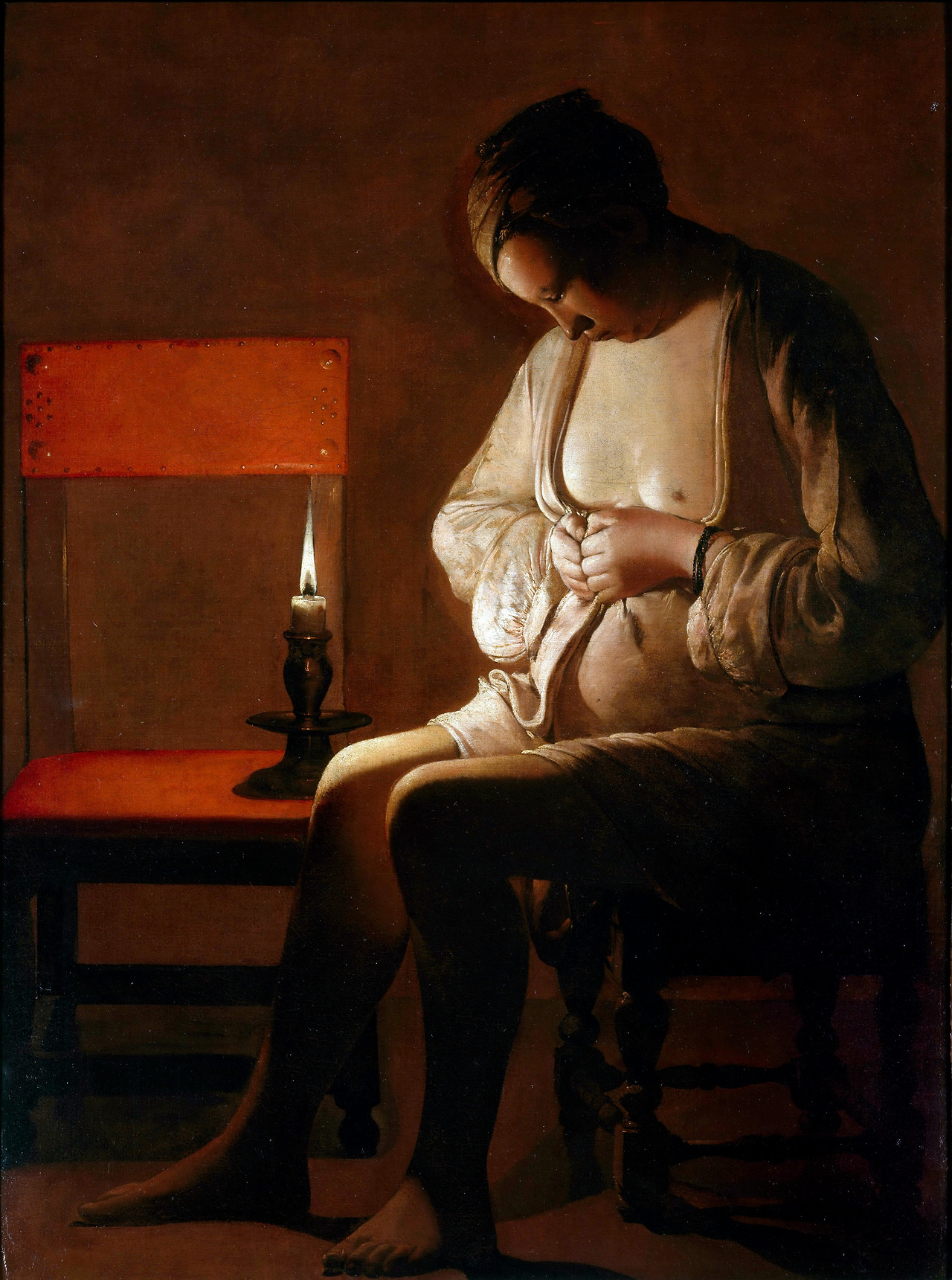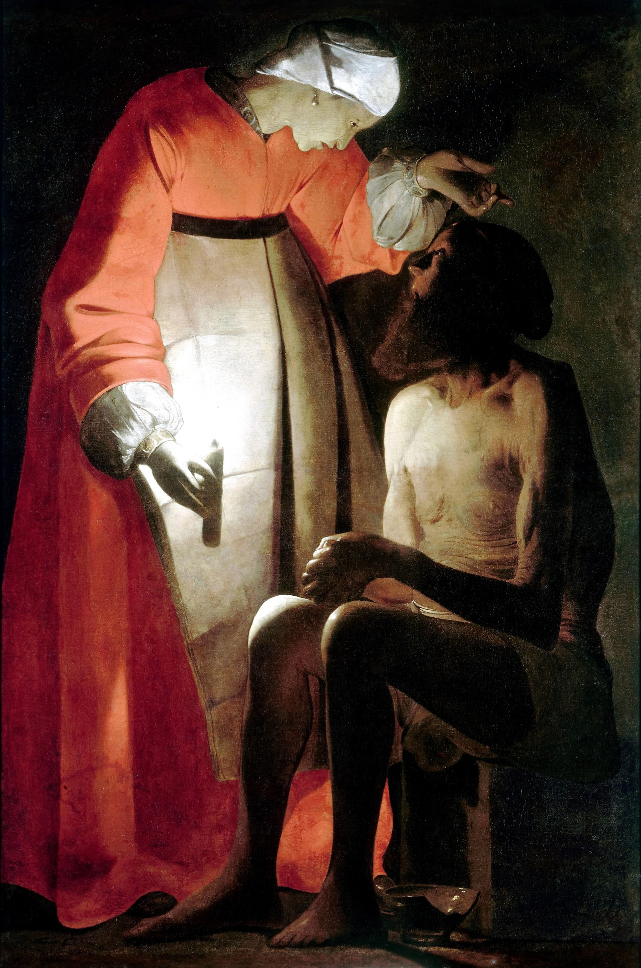 촛불의 화가 라 투르의 그림은 생생한 인물 묘사는 현대적이다. 명암의 분명한 대비, 간결한 표현 , 조각을 보는 듯한 착각. 불빛에 의해 드러남과 불빛에 의해 감추어지는 부분. 명암에 의한 인간의 내면 심리를 극적으로 보여준다. 불빛 아래 막달레나, 아내에게 조롱당하는 욥. 벼룩을 잡는 여인. 점쟁이 등. 빛은 인간의 아픔을 드러내고 또 상처를 보여주면서 동시에 치유하기도 한다. 빛은 죄지은 자에겐 두려움이며 동시에 구원이고, 또 욥의 아내가 들고 있는 촛불의 강렬도는 폭력적이기도 하다. 그리고 갈등을 일으키는 불꽃의 흔들림은 불안한 인간 심리를 말하는 것 같다.