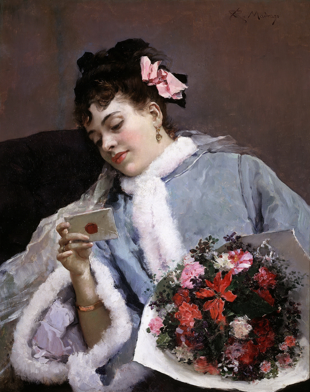 여인의 창백한 피부를 강조하기 위해 푸른색 외투의 질감을 개성 있게 강조했다. 오른손에 들고 있는 카드는 아마도 왼손에 들고 있는 꽃다발과 함께 도착했을 것이다. 이 작품은 라이문도 마드라조의 작품을 특징짓는 심오한 리얼리즘 스타일로 볼 수 있다. 그녀의 왼손에 들고 꽃다발은 특히 아주 잘 표현된 부분인데. 그 꽃다발은 그 자체만으로도 웅장한 정물화다.