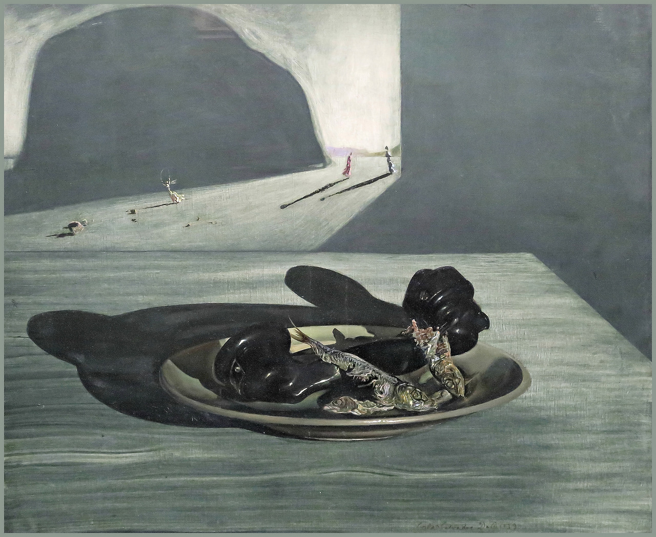 "Téléphone dans une assiette avec trois sardines grillées fin septembre" 1939 Salavador Dali
