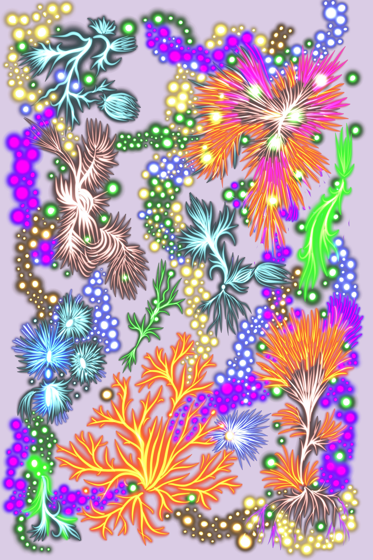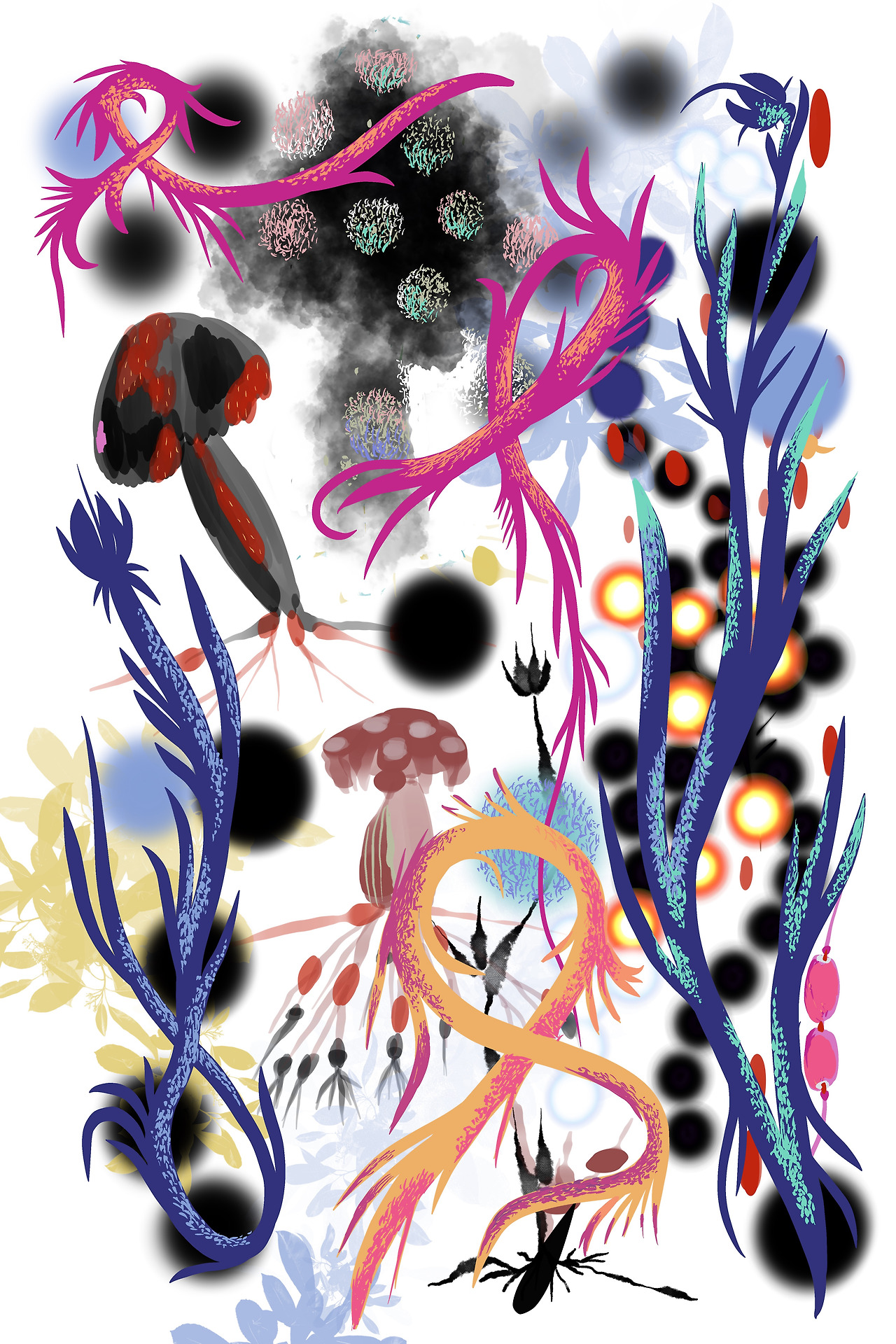 모든 생명은 성장과 붕괴의 거대한 숲이다. 바위에 자라는 이끼류는 느리게 바위에서 나오는 미네랄과 공기의 영양분을 천천히 소화하며 성장한다. 성장의 보편적 질서를 화가를 캔버스에 복제해보려 했다. 또한 바닷속. 숲의 공생과 해체에 대해서도 우리는 바라볼 수 있다. 생명들의 교차점, 더 가까이 다가가면 볼 수 있는 것. 현실의 세계. 우리가 사는 행성의 생명에 대해 우리는 다시 한번 그것들에게서 진리를 배울 수 있다. 꽃과 식물들 미시세계와 다를 바 없는 균류들. 혈관과 수생식물과 미세혈관 같은 것에서 새싹, 꽃, 균류들의 복합적이고 파생적인 생성과 소멸과의 미궁을 만난다.