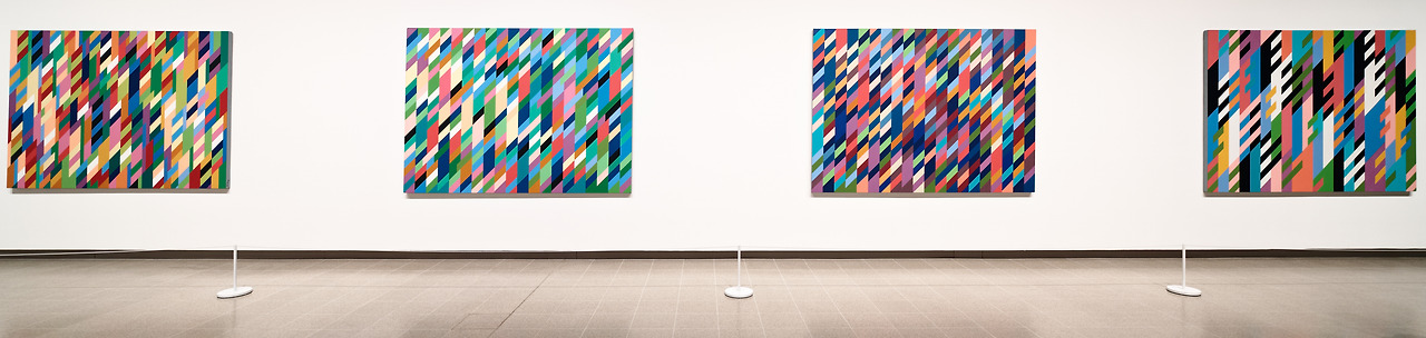 From Here (1994), High Sky (1991), November (1990) and Justinian (1988), all oil on canvas A7R03636 Bridget Riley exhibition, Hayward Gallery, London