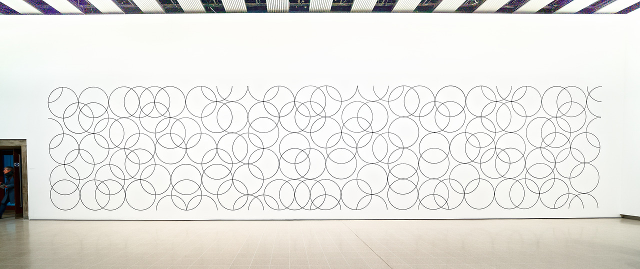 Composition with Circles 4, 2004 (Graphite, acrylic paint and permanent marker on plaster wall) A7R03604 Bridget Riley exhibition, Hayward Gallery, London