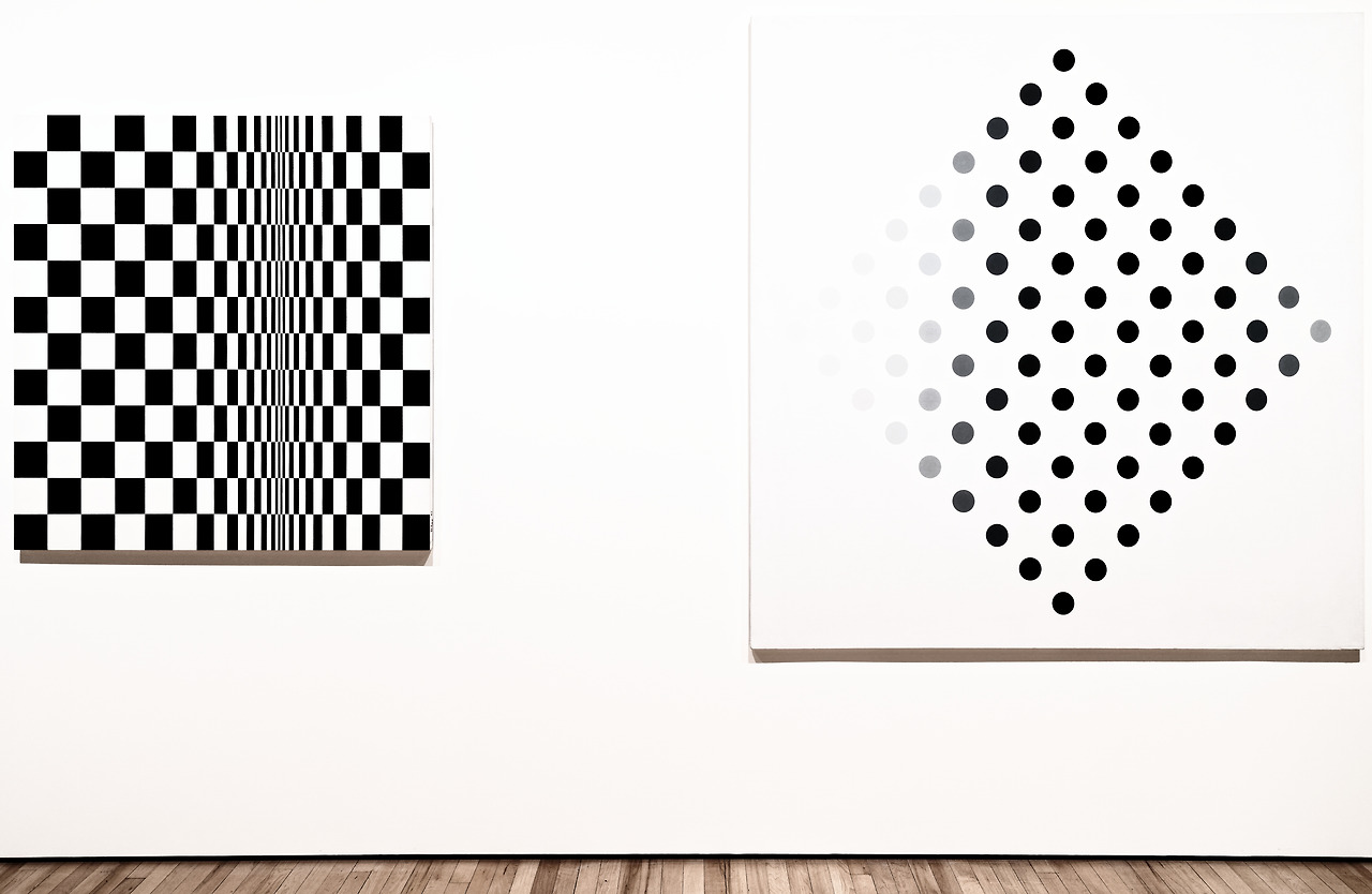 Movement in Squares (1961), Synthetic emulsion on board; Black to White Discs (1962), Synthetic emulsion on canvas A7R03751 Bridget Riley exhibition, Hayward Gallery, London