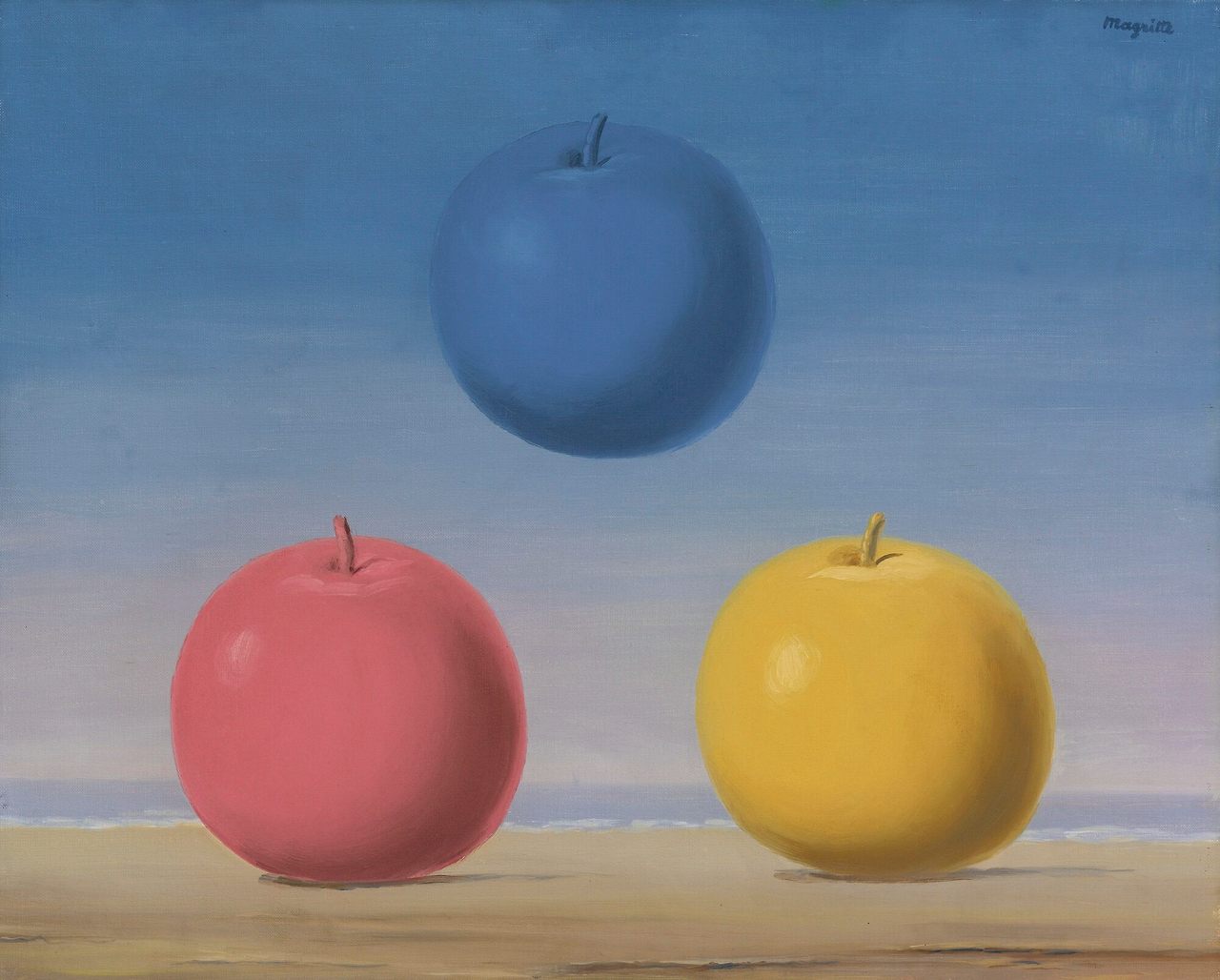 사과는 마그리트의 작품에서 가장 눈에 띄는 반복적인 상징적 이미지 중 하나이다. 그의 작업 전반에 걸쳐 다양한 맥락에서 사과가 등장한다. 때로는 방 안 전체를 채우기 위해에 괴기스럽게 확대되었고, 때로는 석화되거나 초상화로 나타나 보모의 얼굴을 대체하기도 한다. 이 평범한 사물은 종종 전통적인 장르의 정물화와 연관되어 있기 때문에 무엇 하나로 정해진 주제와 설명. 의미로 정의될 수 없는 무한 변형이다.