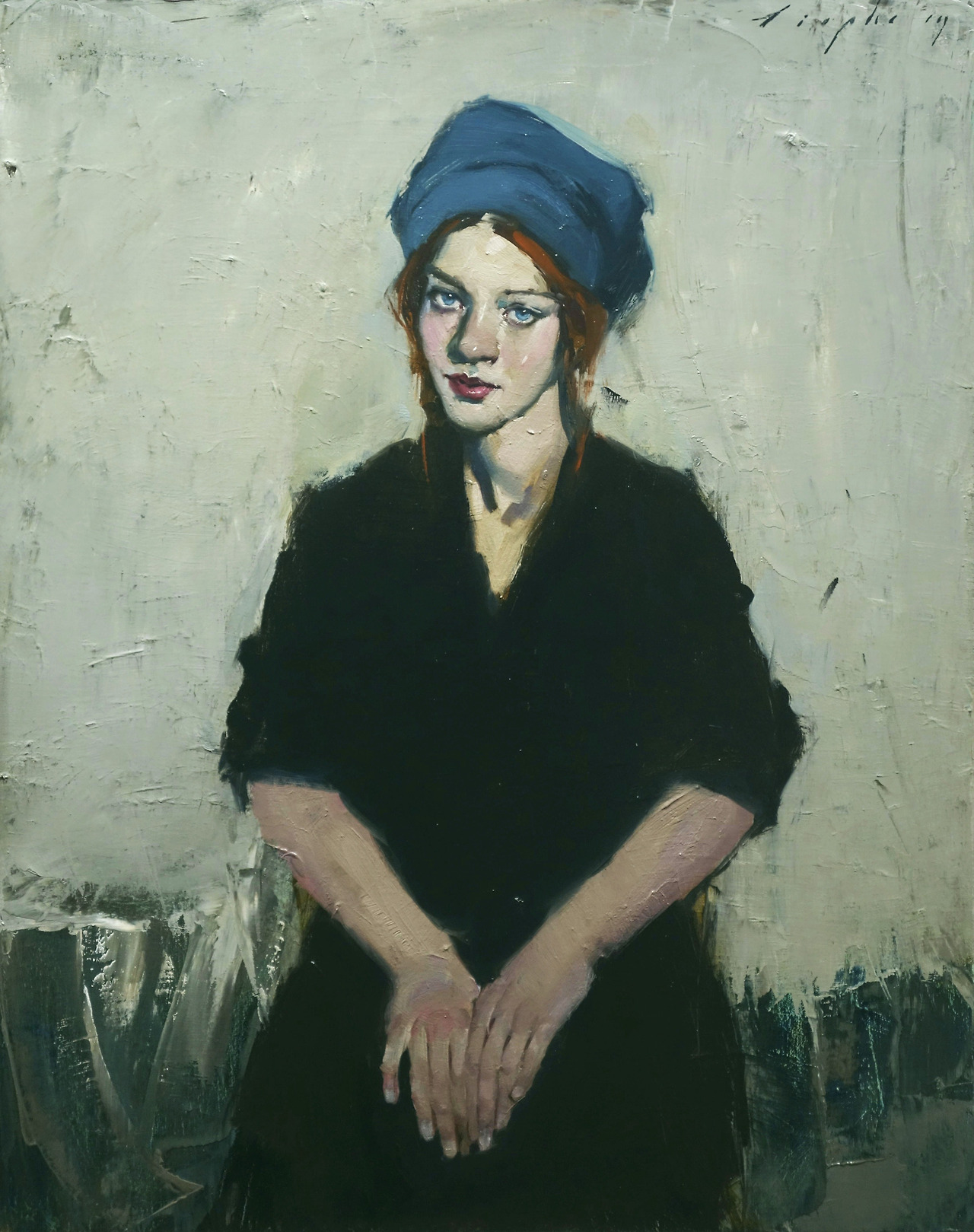 Blue Hat (2019) (olio su tela 76,2 x 61 cm)