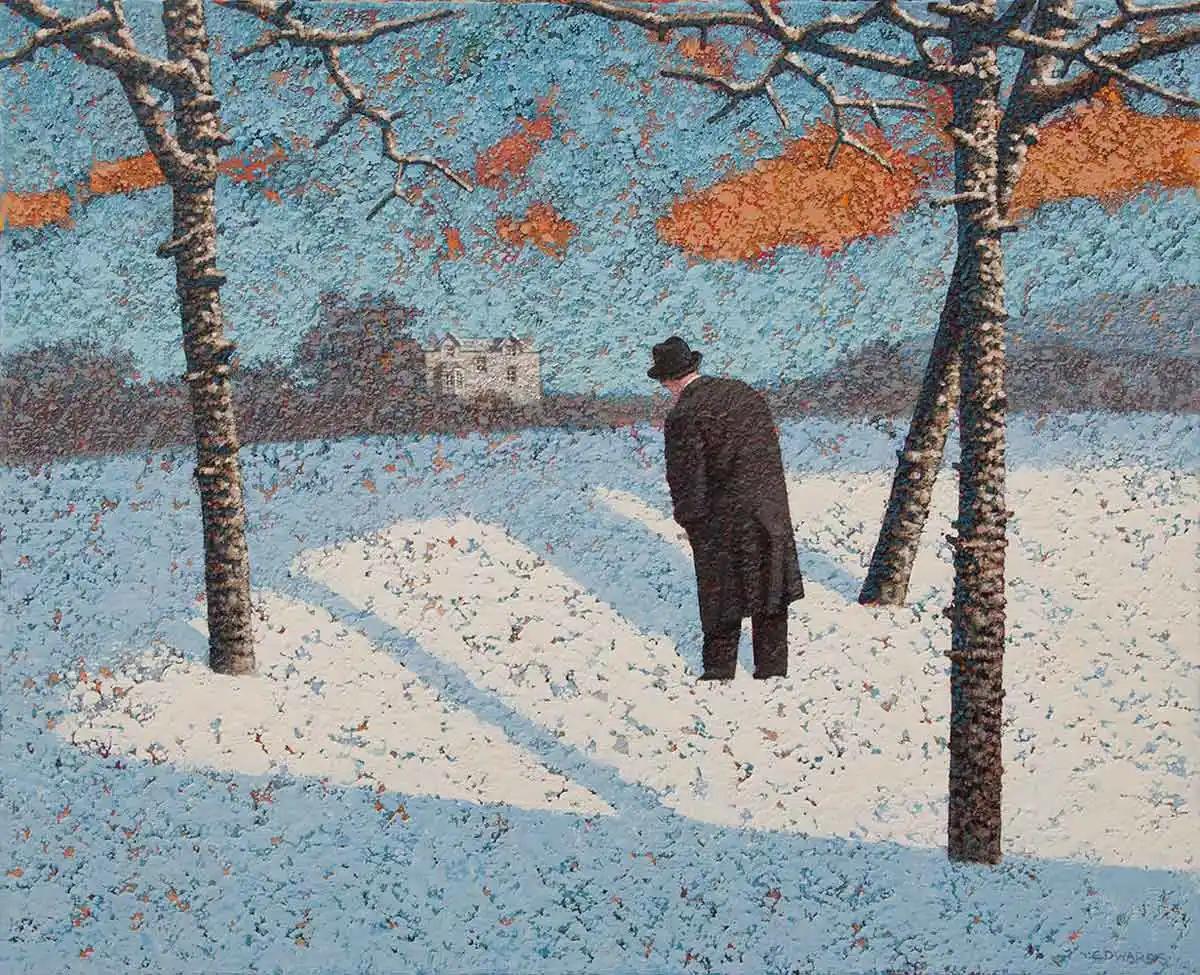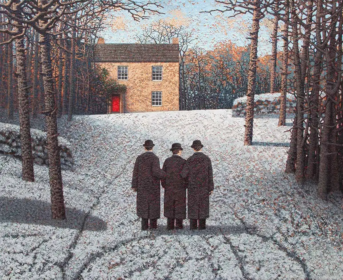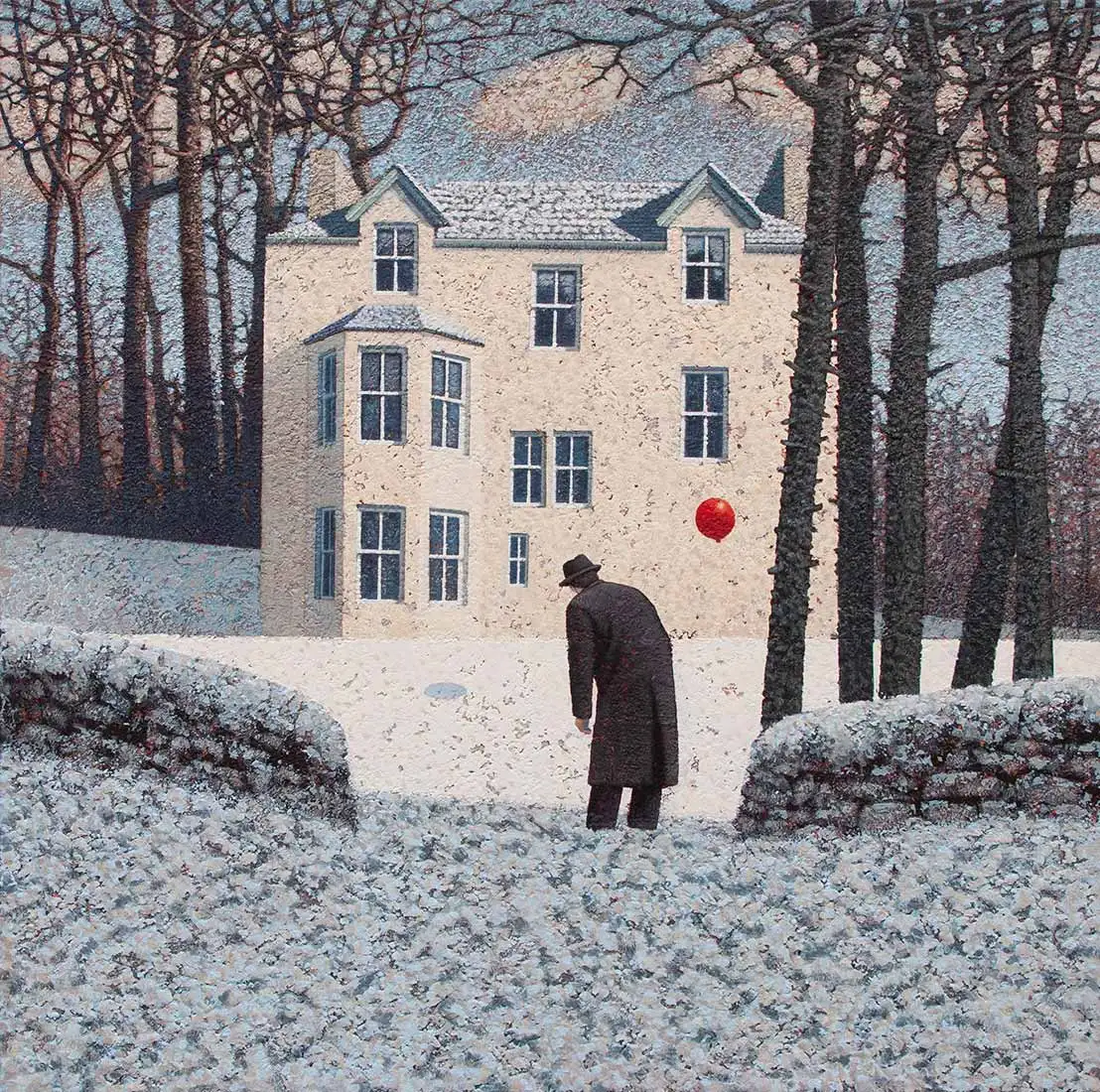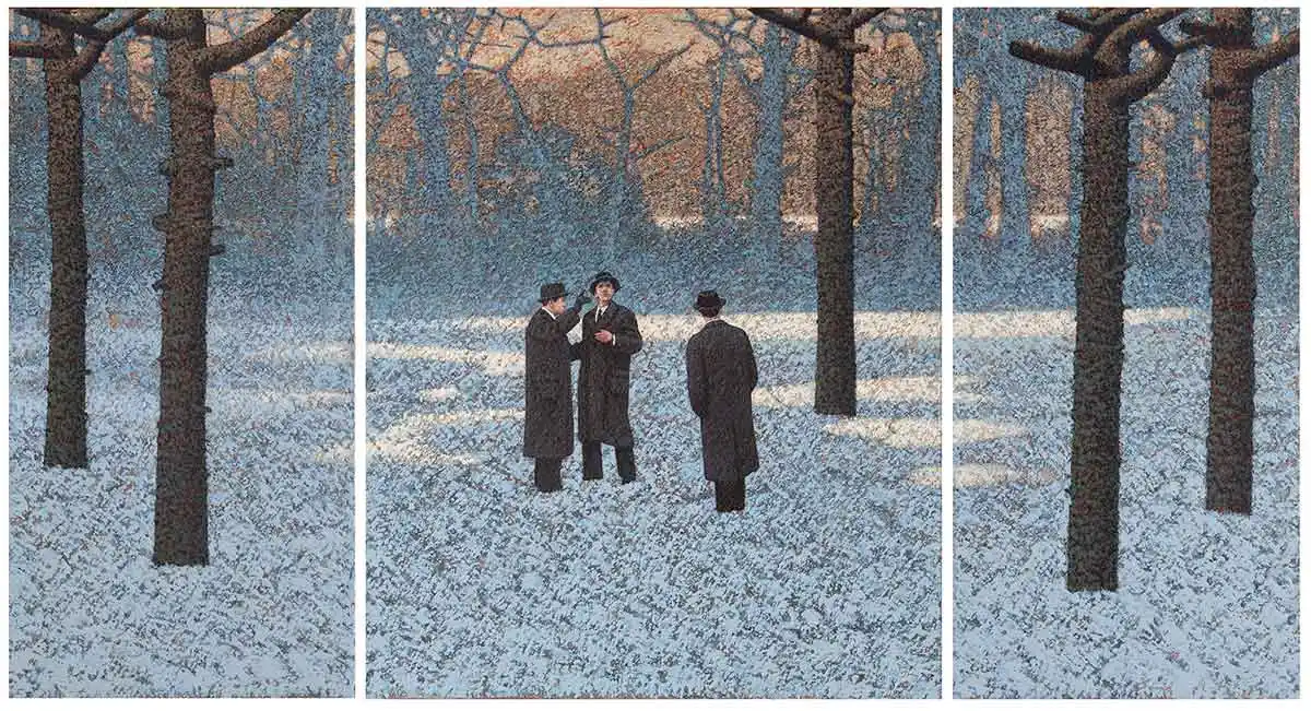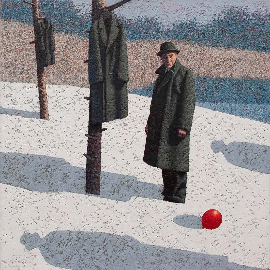제목과는 상관없이, 눈의 풍경 속에 겨울나무. 검은 프록코트의 중절모의 중년 남자들의 엇비슷한 풍경 속에 서 불안한 표정, 긴장된 그림자. 뭔가를 기다리는 듯하면서 빨간 풍선과 붉은 문을 바라보는 그림들은 우리에게 초현실적 그림 안에서 사실적인 생의 살풍경을 보여준다. 우리는 도대체 무엇을 결정하고 살고 있는가.