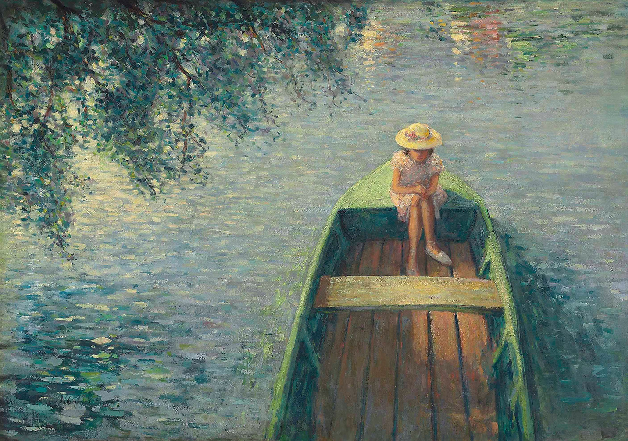 밝은 색조의 생동감 있는 분위기를 자아내는 그림이다. 나무 그늘 아래 보트가 있고, 화가의 맏딸 마테로 추정되는 소녀가 뱃머리에 다리를 꼬고 앉아 있는 장면을 위에서 아래로 내려다보는 구도로 그렸다. 이는 화가의 넓은 시야를 잘라내고 잘라낸 접근 방식의 그림이다. 화폭에 넓은 시야를 좁혀 채워 넣어 다채로운 색상의 섬세한 표현과 따뜻한 분위기를 숨긴 듯이 드러냈다. 미술적 경험의 첫인상에 그림은 평화로움과 약간의 우울감을 느끼게 한다. 부드러운 이 우울감을 위해서 우리는 물을 찾는다. 그곳에서 물속에 드리워진 채색의 흔들림을 보면서 내면의 흔들림을, 파장을 허용하는 것이다.