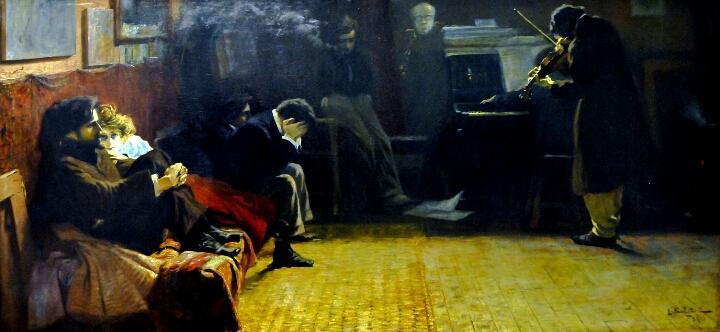 한 남자가 바이올린을 켜고 있습니다. 등을 보인 남자의 음악에의 열정을 보여주는 왼손의 긴장을 보십시오. 그 너머 피아노를 치는 남자가 건반 위로 뻗은 왼손이 보이고 악보가 쌓인 피아노 뒤에 얼굴 윤곽이 흐릿한 남자 시선 없는 눈으로 무엇을 응시할까요. 아마도 음악이겠죠. 그리고 두 손 주머니에 찔러 넣고 고개를 내린 남자의 뿜은 담배 연기는 아마도 음악을 눈으로 보여주는 것이 아닐까 싶네요. 담배를 피우는 남자의 오른쪽 아래 눈이 움푹하게 들어간 남자 또한 어떤 응시의 눈을 하고 있네요. 그리고 얼굴을 두 손에 묻은 남자가 보이네요. 이 그림에서 음악이 어떤 음악인지 보여주는 것 같네요. 그는 음악을 들으면서 지기 내면과 맞닿는 음악 속에서 고뇌하고 있네요. 무엇일까요? 어떤 삶의 비의 일까요? 이 그림의 제목은 베토벤입니다. 창 아래 가장 밝은 쪽 소파에 꺼져 들어간 연인들이 보입니다. 남자도 이미 깊게 음악 속에 빠져버린 상태군요. 마치 접신의 상태처럼 엑스타시입니다. 그런 연인의 얼굴을 바라보는 여자의 파란 눈을 보십시오. 남자를 음악처럼 사랑하는군요. 어떤 음악일까요. 어느 소도시의 후미진 뒷골목 카페의 늦은 밤입니다.