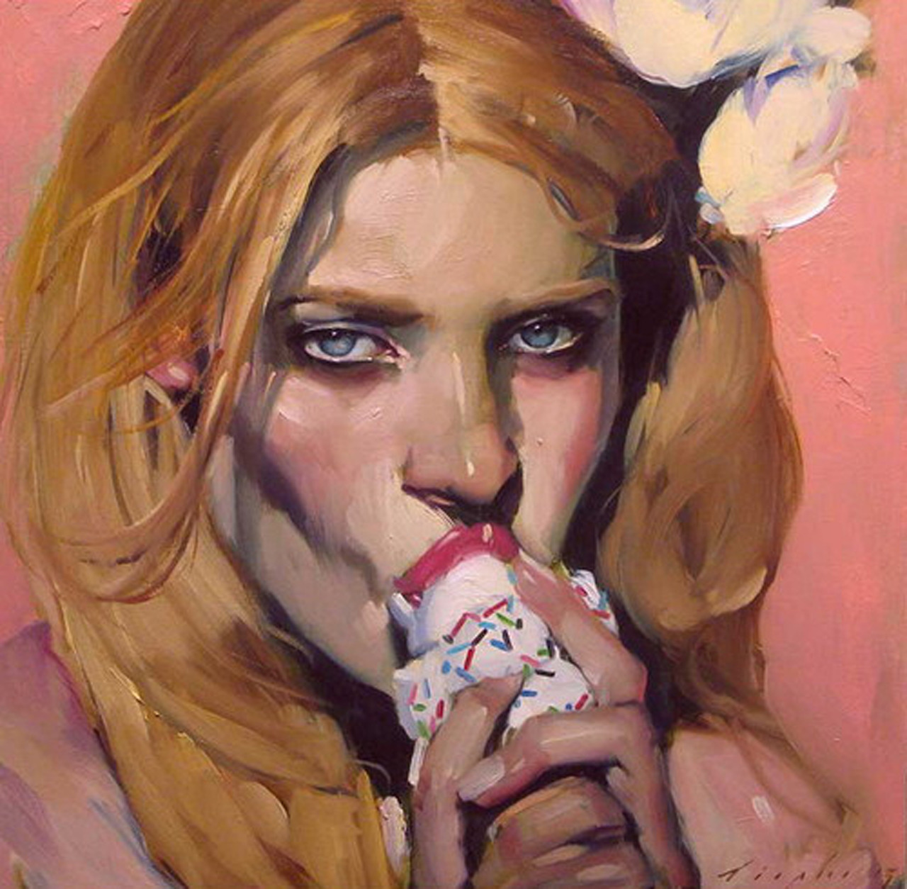 꽃 머리 장식을 한 금발의 여성이 아이스크림을 먹고 있다. 달리 보면 아이스크림을 빨고 있다. 달리 보면 욕망을 섭취하고 있다. 눈으로 정면을 응시하고 있다는 것은 마주 보는 대상을 정면으로 응시하는 것이고 욕망을 물적으로 받아들이는 현대인의 전형적인 모습이며, 여기에서 눈과 아이스크림을 빠는 행위를 통해 관능성을 드러낸다. 꽃 머리 장식은 순수성의 한다면을 가지고 있지만, 꽃 머리 장식(순수)은 다만 치장일 따름이다. 두 손으로 아이스크림을 거머쥐고 있는 것은 보다 더 디테일한 섹슈얼리티의 한 장면을 연상하게 하고, 붉은 입술의 관능성은 당당하고 과괌한 현대인의 성적 욕망, 물적 욕망의 정당성을 드러낸다. 도시의 일상이란 보다 섬세하고 복잡한 욕구의 출구와 입구, 그리고 단절되고 차단된 욕망의 뒤얽힘의 커다란 회로망 같다. 그 안에서 작은 일상의 이유 사소한 일상의 이유는 우리를 쾌활한 욕구의 정치학으로 살게 하고 때론 화려한 이면에 숨긴 어두운 내면의 페르소나를 들추어내기도 한다. 보라. 이것은 가면인가? 사회가 우리에게 덧씌운 욕망의 가면이라면 그것 또한 긍정의 욕망으로 받아들여나 할까. 아님 거부해야 할까. 아님 그냥 덮어쓰고 살아야 할까. 가면이 아니라 단지 화장한 얼굴이라 치부하면 그만일까.