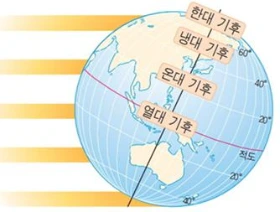 위도입니다. 저위도 지역은 단위 면적당 일사량-태양 복사에너지가 지표면에 닿는 양-이 많아 기온이 높고, 고위도로 갈수록 단위 면적당 일사량이 적어지면서 기온이 낮아집니다. 고위도는 저위도에 비해 여름과 겨울의 단위 면적당 일사량 차이가 커 기온의 연교차-일 년 동안의 기온 차이-가 큽니다.