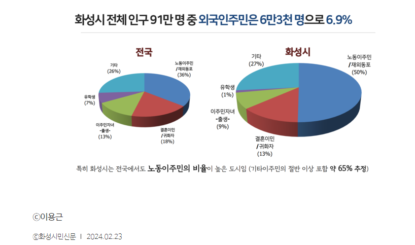 화성시는 요즘 광고를 통해 수원, 고양, 용인, 창원과 같은 '특례시' 선정을 바라는 시 이미지 광고를 하고 있습니다. 화성시뿐만 아니라 제조업이 발달한 주요 지자체의 상당수 인구를 외국인 주민이 차지하기 시작한 것은 꽤나 오래전 일이 되었습니다.