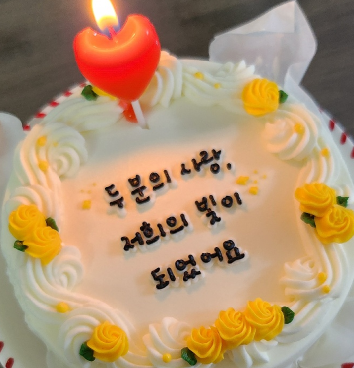 그렇게 혼자 먼저 집 앞에 와 보니 자그마한 봉투가 문 앞에 놓여 있었다. 조심스레 열어 보니 비니와 하니가 결혼기념일이라고 보낸 케이크이었다.