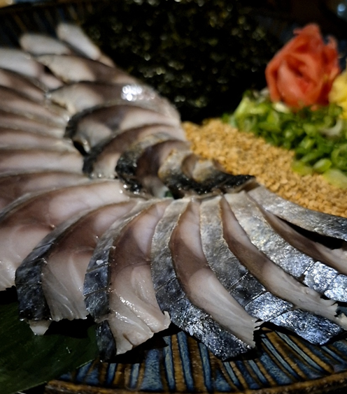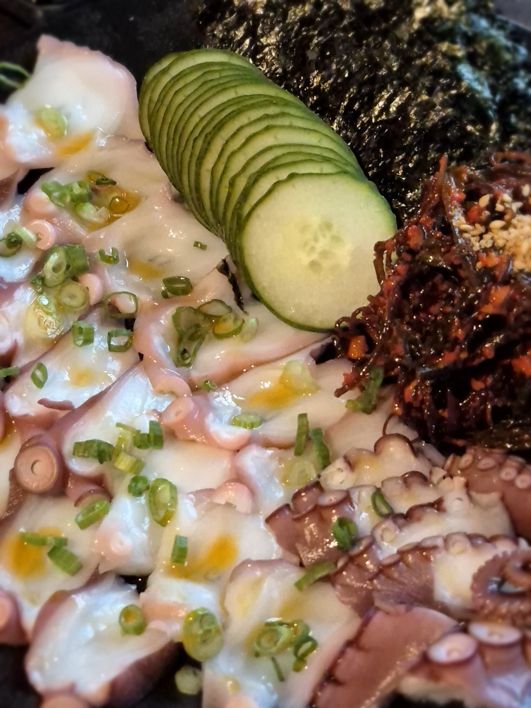 묵은지 모듬회, 고등어 초회, 피문어 숙회, 감태두른 새우 성게알