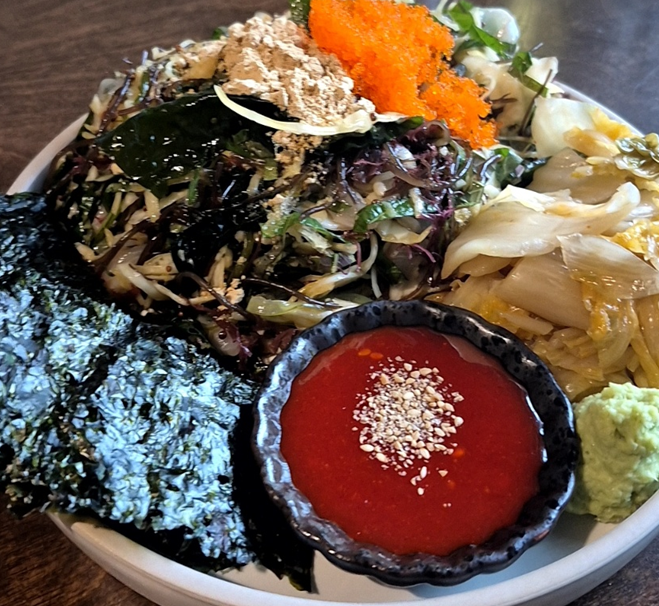광어의 찰진 식감, 고등어 초회의 산뜻함, 쫄깃하면서 달달한 피문어, 몽글거리면서 화한 향이 입안 가득 남아 있는 성게알, 톡톡 터지는 연어알, 촉촉한 새우살 그리고 고소한 감태와 다채로운 해초들.