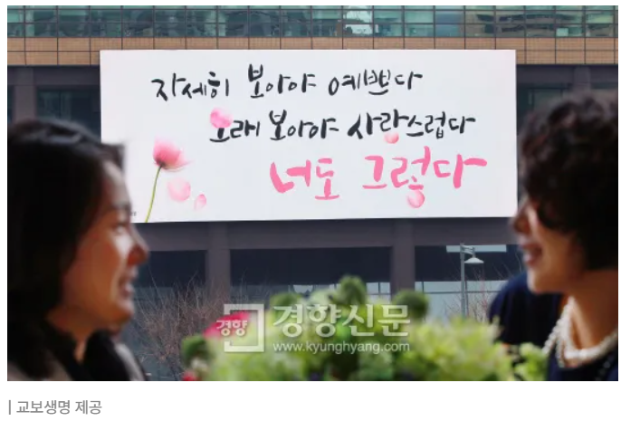 <풀꽃>이 발표된 해가 월드컵으로 온 나라가 떠들썩하던 2002년이더군요. 그런데 시인이 지금처럼 유명해지기 시작한 건 말이죠. 그로부터 10년이나 지난 2012년이었습니다. 저도 본 적이 있는데요. 광화문에 위치한 교보생명이 주기적으로 선정하는 대형 글자판에 <풀꽃>이 내걸린 게 계기가 되었다고 하네요.