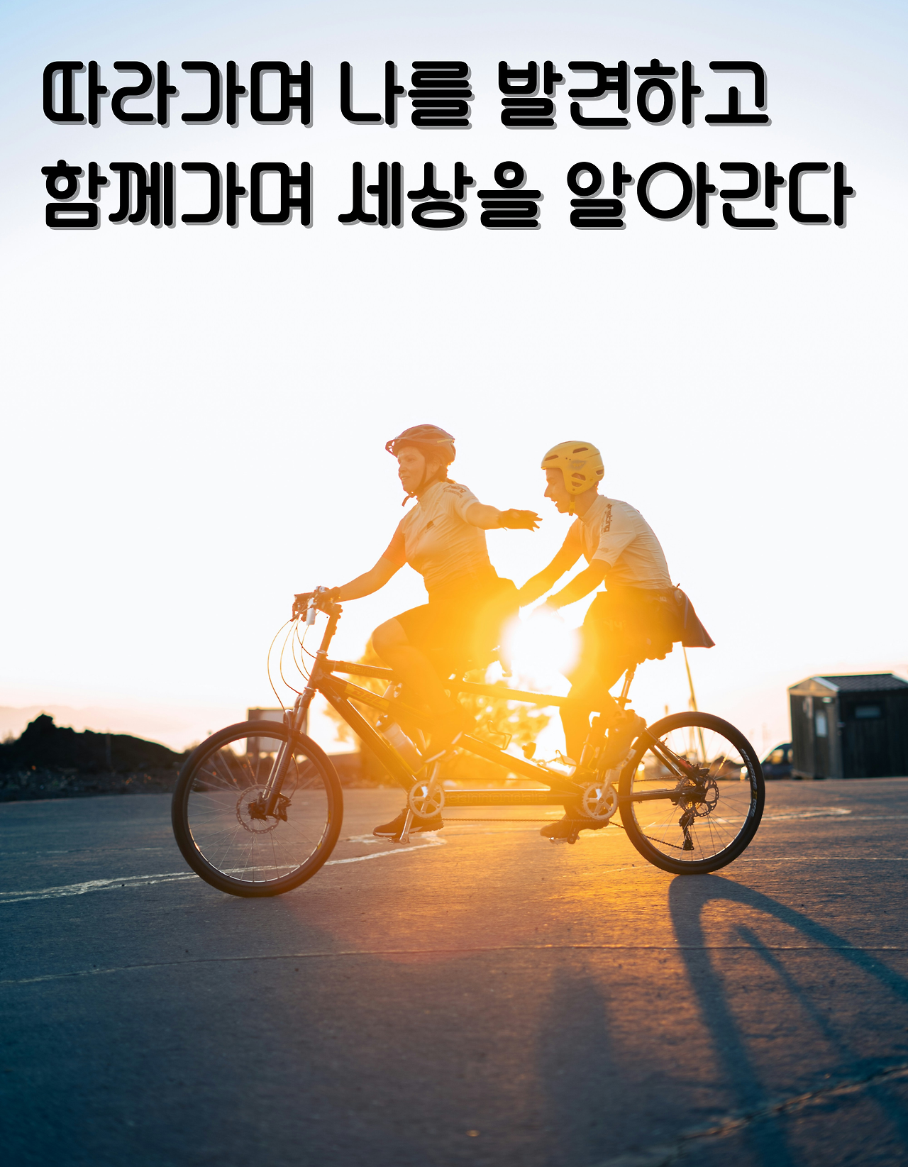 2인용 자전거에 앞뒤로 앉아 균형과 페달링, 방향 전환에 대해 대화를 나누며 배운다. 나란히 페달을 밟으며, 속도를 맞추고 서로를 배려한다. 언덕길을 만나면 속도를 낼지, 멈추어 같이 걸을지, 잠시 쉴지를 결정한다.