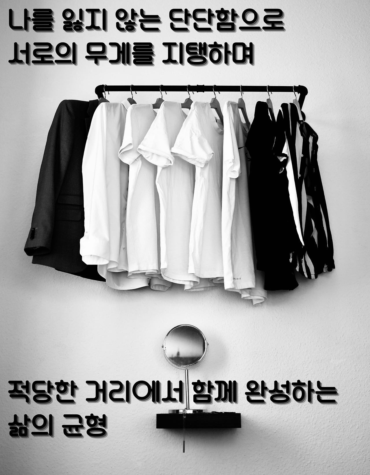 우리는 결국 ‘함께’ 일 때 비로소 온전해진다. 그러나 맹목적인 함께함은 아니다. 옷은 옷걸이 없이 형태를 잃고, 옷걸이는 옷 없이 소명을 잃으며, 이들이 없는 옷장은 그저 텅 빈 나무 상자일 뿐이니.