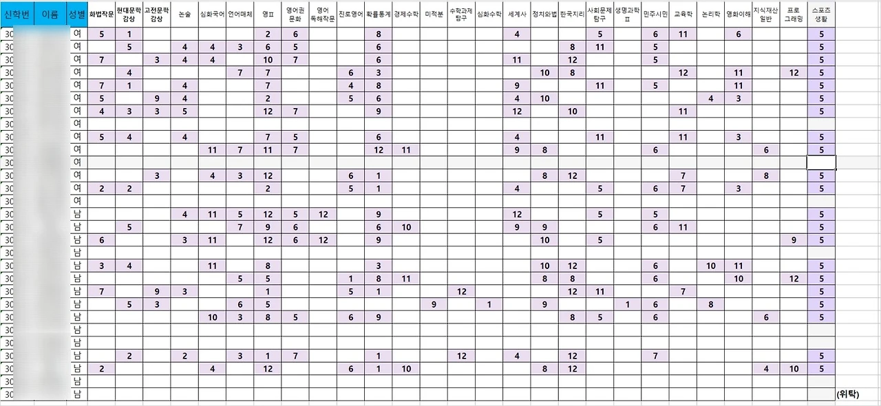 그런데 이런 고등학교 교실 속 추억들이 이제는 쉽게 재현되지 못할 거라는 불안한 징조가 슬슬 만들어지고 있습니다. 아래는 올해 고3 우리 반 학생들 시간표입니다. 교육과정 편제상 1인당 이수해야 할 과목이 총 11개입니다. 하지만 학생별로 선택 과목이 다 다릅니다. 5일간 스포츠 생활(체육) 2시간을 빼곤 모두 다릅니다. 스생 2시간을 빼고는 모든 학생들이 각자 이동하면서 수업을 듣습니다. 일정은 이미 대학생입니다. 게다가 같은 과목을 신청하였더라도 실제 수업은 여러 개 반으로 편성되어 있습니다. 예를 들어 한국지리를 선택으로 신청했더라도 실제 수업은 3학년 8반, 10반, 12반으로 나누어집니다. 그렇기 때문에 같은 과목이어도 다른 반에서 수업을 듣는 확률이 더 높습니다.