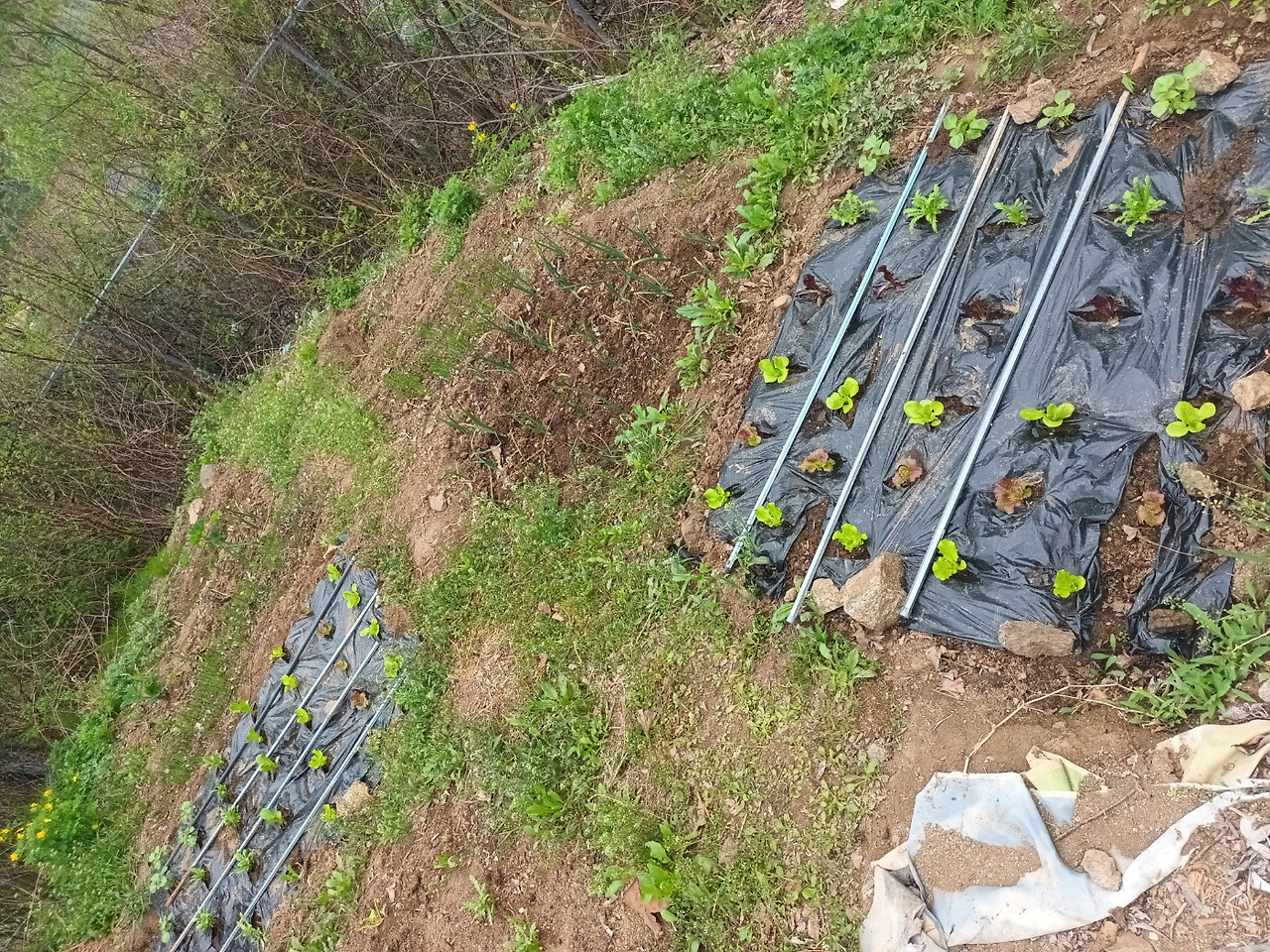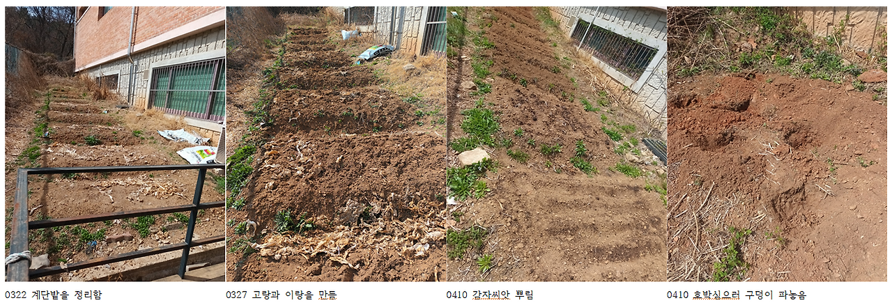 그런데 신쌤 농사의 진짜 시작은 체육관 옆 쪽밭에서 부터입니다. 이곳은 펜스 안에 있는 여럿의 텃밭이 아닙니다. 그 밭을 바라보면서 오른쪽으로 한참 고개를 돌리면 주차장 끝 구석에 그냥 그렇게 있던 경사면이었습니다. 이곳을 혼자 일구기 시작한 거 역시 신쌤이었습니다. 3월 마지막주에 갔더니 층층이 계단을 만들어 놓고 돌을 고르고 있었습니다. 그 이후 근 한 달 동안 펜스 안 텃밭을 돌보면서 이곳에도 거름을 뿌리고 고랑과 이랑을 만들었습니다. 특히, 고랑, 이랑의 모습은 참 잘 빗어 넘긴 머리처럼 정갈했습니다. 보는 것만으로 마음이 편안해지더군요. 거기에 감자, 열무, 애호박, 쌈채소를 심어 놓았습니다. 쌈채소와 열무는 한 달 새 제법 쑤욱하고 올라왔네요.