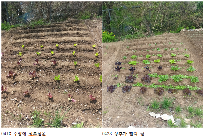 # 나와 오랫동안 전근오기전부터 같은 곳에서 근무했던 동갑내기 박쌤밭입니다. 늦은 결혼에 아직 아이가 어린데도 주말을 반납하고 와서 쌈채소를 조록조록 심었더군요. 이제는 제법 흐드러지게 올라와서 조만간 수확할 계획이라고 합니다. 산책을 하다 자주 이곳으로 같이 발길을 돌리게 되는 사람입니다.