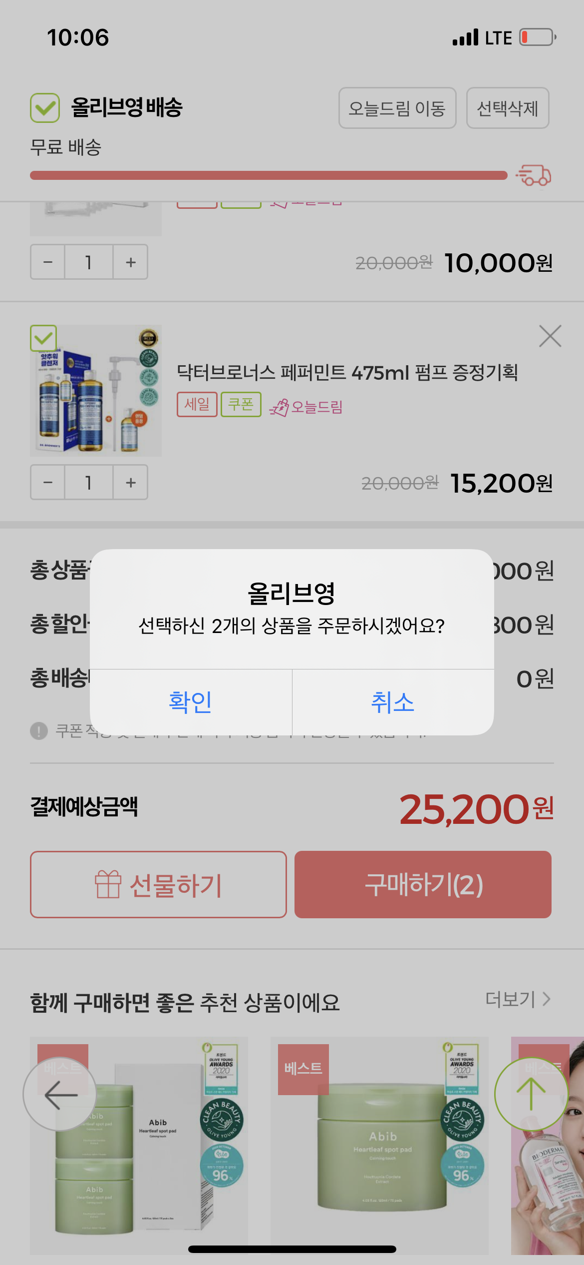 올리브영 App에서 찾아볼 수 있는 본 레스토프 효과는 먼저 장바구니에 제품을 담았을 때 우측 상단의 장바구니 모양에 빨간 원이 생기고, 하얀색으로 장바구니의 담은 숫자가 변하는 것을 꼽을 수 있다.