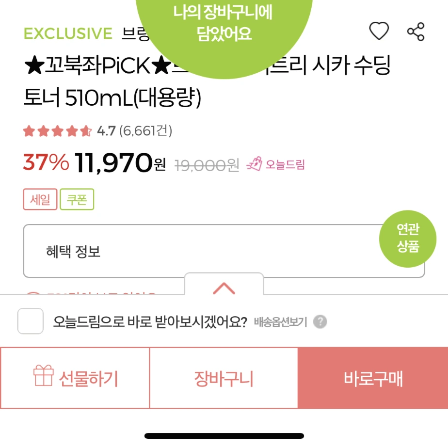 또한 App하단의 선물하기, 장바구니, 바로 구매 3가지의 선택지 중에서 바로 구매만 글자와 배경색을 반전하여서 더 큰 구매전환율을 노렸다.