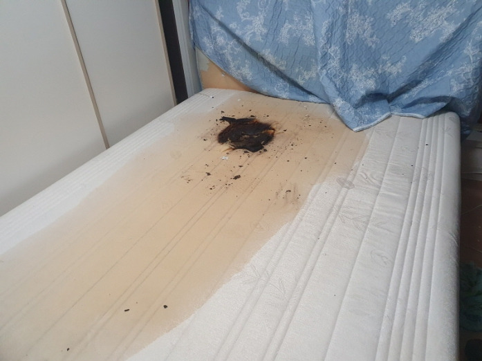 라텍스 매트리스 위에 전기장판을 사용하여 화재가 발생한 현장