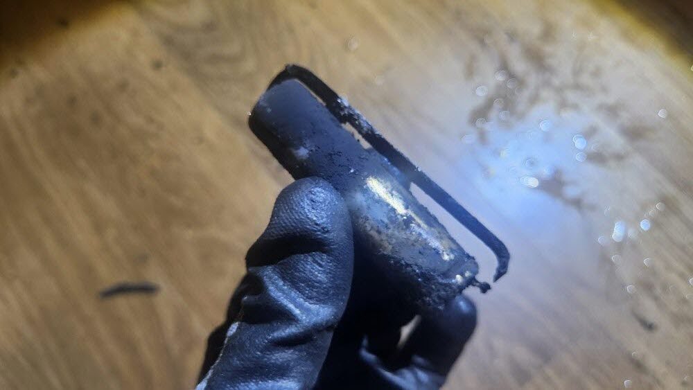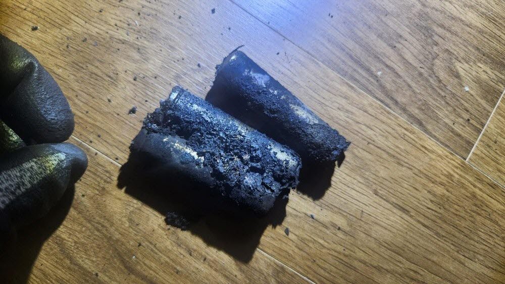화재 현장 바닥에는 선풍기 하부에서 나온 탄화된 배터리 잔해들이 다수 발견되었다.