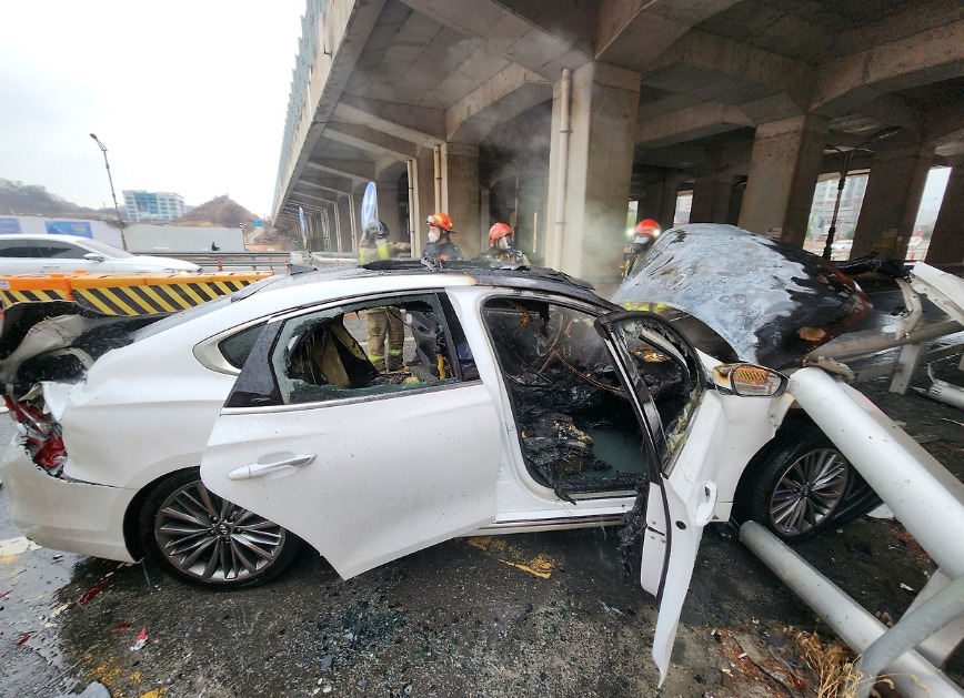 다음은 교통사고로 인한 차량 화재 사례이다. 신고 내용에 따르면, 가드레일과 충돌한 승용차의 엔진룸에서 화염이 발생하고 있다는 내용이었다. 다행히 화재 차량을 뒤따르던 다른 차량 운전자가 운전자를 구조해 화재로 인한 인명피해를 막을 수 있었고 현장에 도착한 소방대원들은 화재를 즉시 진압하였다. 교통사고 후 사고 충격으로 차량 화재가 발생할 수 있는데, 이때 운전자가 부상을 입거나 의식을 잃으면 차량에서 신속히 대피하지 못해 큰 부상을 입거나 심각한 경우에는 사망에 이를 수 있다. 교통사고를 예방하려면 항상 안전 운전을 실천하고, 졸음운전 시에는 충분히 쉬어가는 여유를 가져야 한다.