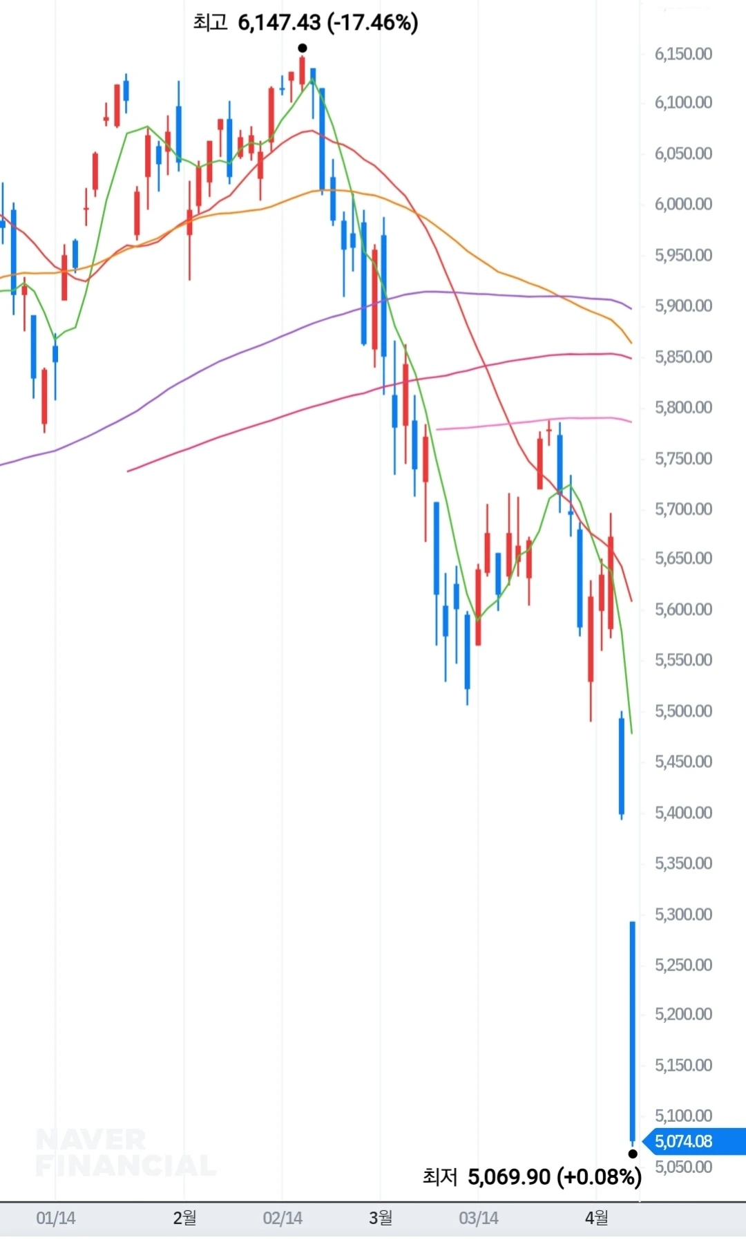 4월 3일, S&P500은 -4.88%, 나스닥은 -5.97%, 다우존스는 -3.98% 각각 하락했다. 4월 4일에도 추가 하락이 이어졌고, S&P500은 -5.97%, 나스닥은 -5.82%, 다우존스는 2,231포인트(-5.50%) 급락했다. 변동성 지수(VIX)는 45.31까지 치솟아 2020년 팬데믹 이후 최고치를 기록했다.