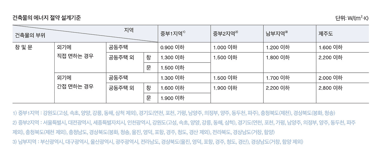 국토교통부에서는 「건축물의 에너지 절약 설계기준」을 통해 부위별로 열관류율을 규정한다. 먼저 창이나 문이 외기와 직접 면하는지, 간접 면하는지의 여부를 나누고 해당 건축물을 공동주택과 공동주택이 아닌 경우로 세분화한다. 공동주택이 아닌 경우에는 개구부의 용도가 창인지 문인지에 따라 조금씩 차이가 있다. 전국적으로 중부지역부터 제주도까지 겨울철 외기 온도가 낮게 형성되는 순으로 지역을 중부1과 중부2, 남부와 제주도로 구분해 기준을 조금씩 다르게 규정한다. 겨울철 기온이 낮은 곳은 열관류율 기준을 낮게 설정해 건축물의 단열 성능을 높게 하도록 제안하고 있다. 이때 해당 부위의 성능을 만족하는 건축자재를 사용해야 한다.