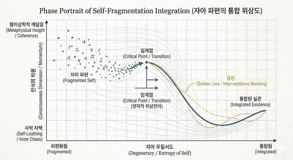 [그림 1] 자아 파편의 통합 위상도(Phase Portrait of Self-Fragmentation Integration): 사유를 바탕으로 AI가 생성한 심리-물리학적 전이 모델. (© 2026. 가로등 & Gemini Collaboration)
