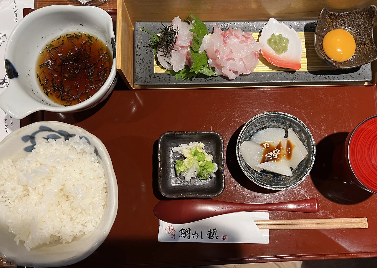 먼저 도미회를 즐기고, 계란 노른자를 밥에 넣고, 소스를 뿌리고 도미회를 밥 위에 올려 같이 덮밥으로 먹는 것 같았다.