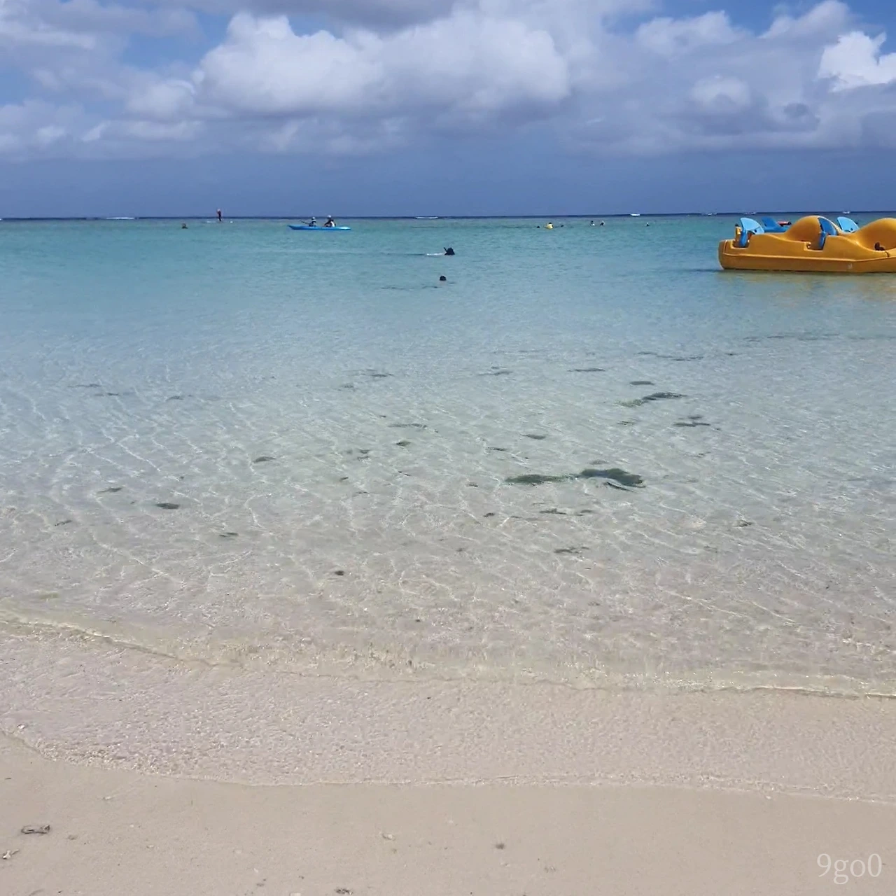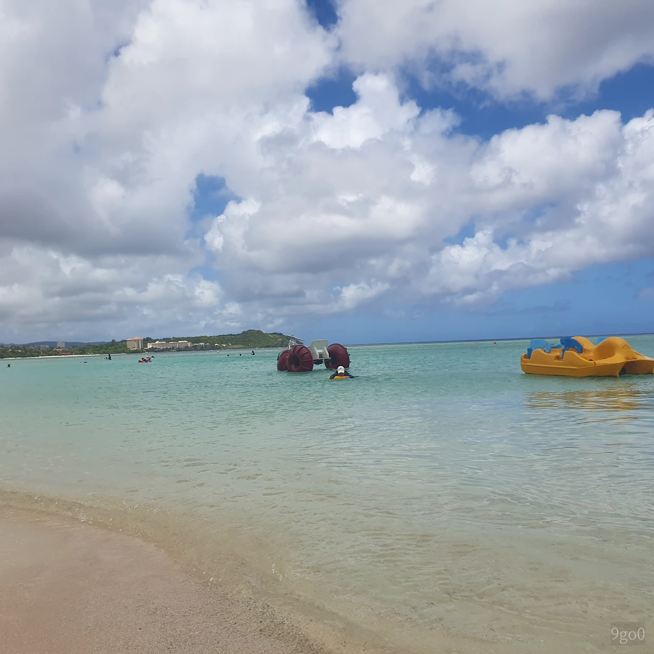 곱지만 뜨겁게 달궈진 모래는 눈부셨고 발 담근 바닷물은 맑은 유리알처럼 투명했다. 아무리 멀리까지 나아가도 물은 허리까지 왔고 파도가 어디에 있는지 의아할 정도로 잔잔했던 투몬비치는 물에서 노는 것은 좋아하지만 수영을 못하는 우리 세 사람이 놀기에는 딱이었다. 이래서 어린아이들을 데리고 괌으로 여행 오는 사람들이 많았구나!